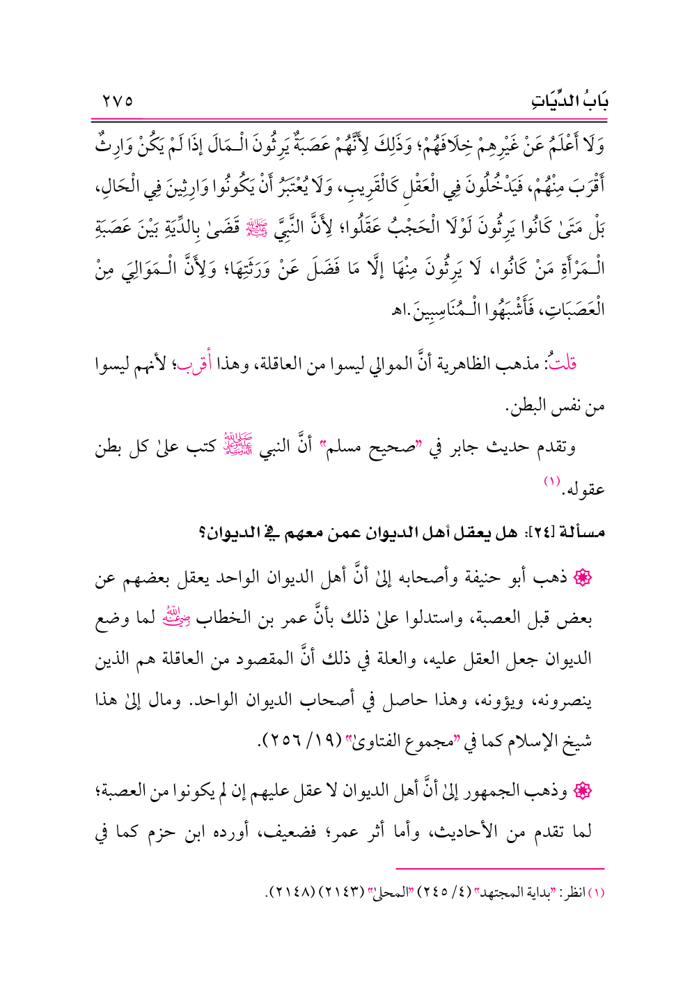 • ذهب أبو حنيفة وأصحابه إلى أنَّ أهل الديوان الواحد يعقل بعضهم عن بعض قبل العصبة، واستدلوا على ذلك بأنَّ عمر بن الخطاب -رضي الله عنه- لما وضع الديوان جعل العقل عليه، والعلة في ذلك أنَّ المقصود من العاقلة هم الذين ينصرونه، ويؤونه، وهذا حاصل في أصحاب الديوان الواحد. ومال إلى هذا شيخ الإسلام كما في «مجموع الفتاوى» (١٩/ ٢٥٦).