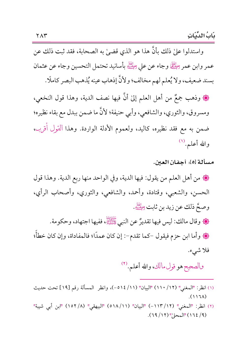 (¬٢) انظر: «المغني» (١٢/ ١١٣ - ) «البيان» (١١/ ٥١٨) «البيهقي» (٨/ ١٥٢) «ابن أبي شيبة» (٩/ ١٦٤) «المحلى» (١٢/ ٦٩).