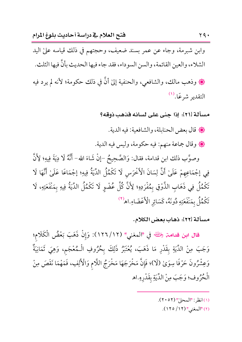 وصوَّب ذلك ابن قدامة، فقال: وَالصَّحِيحُ -إنْ شَاءَ الله- أَنَّهُ لَا دِيَةَ فِيهِ؛ لِأَنَّ فِي إجْمَاعِهِمْ عَلَى أَنَّ لِسَانَ الْأَخْرَسِ لَا تَكْمُلُ الدِّيَةُ فِيهِ؛ إجْمَاعًا عَلَى أَنَّهَا لَا تَكْمُلُ فِي ذَهَابِ الذَّوْقِ بِمُفْرَدِهِ؛ لِأَنَّ كُلَّ عُضْوٍ لَا تَكْمُلُ الدِّيَةُ فِيهِ بِمَنْفَعَتِهِ، لَا تَكْمُلُ بِمَنْفَعَتِهِ دُونَهُ، كَسَائِرِ الْأَعْضَاءِ. اهـ (¬٢)