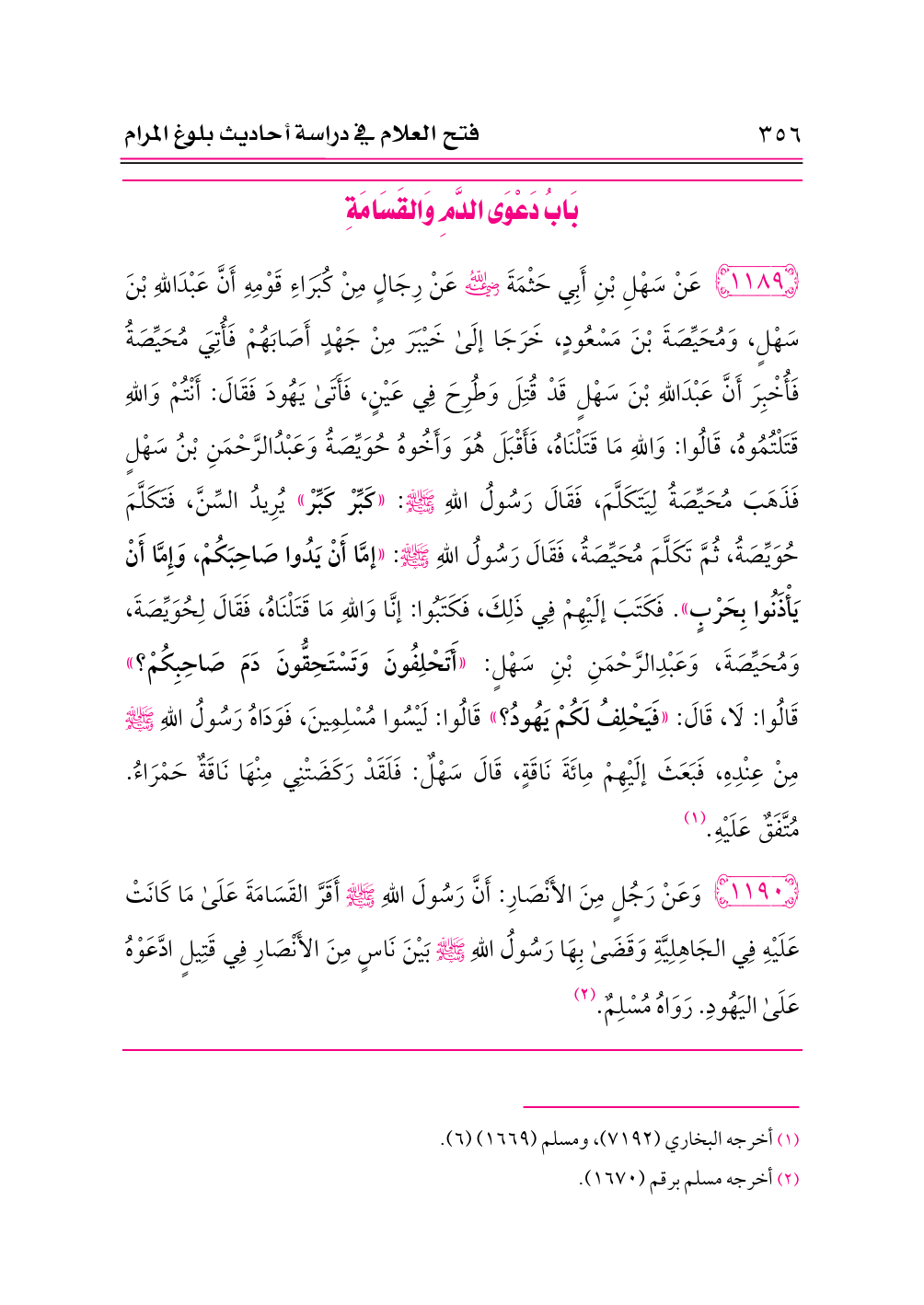 ١١٨٩ - عَنْ سَهْلِ بْنِ أَبِي حَثْمَةَ -رضي الله عنه- عَنْ رِجَالٍ مِنْ كُبَرَاءِ قَوْمِهِ أَنَّ عَبْدَاللهِ بْنَ سَهْلٍ، وَمُحَيِّصَةَ بْنَ مَسْعُودٍ، خَرَجَا إلَى خَيْبَرَ مِنْ جَهْدٍ أَصَابَهُمْ فَأُتِيَ مُحَيِّصَةُ فَأُخْبِرَ أَنَّ عَبْدَاللهِ بْنَ سَهْلٍ قَدْ قُتِلَ وَطُرِحَ فِي عَيْنٍ، فَأَتَى يَهُودَ فَقَالَ: أَنْتُمْ وَاللهِ قَتَلْتُمُوهُ، قَالُوا: وَاللهِ مَا قَتَلْنَاهُ، فَأَقْبَلَ هُوَ وَأَخُوهُ حُوَيِّصَةُ وَعَبْدُالرَّحْمَنِ بْنُ سَهْلٍ فَذَهَبَ مُحَيِّصَةُ لِيَتَكَلَّمَ، فَقَالَ رَسُولُ اللهِ - صلى الله عليه وسلم -: «كَبِّرْ كَبِّرْ» يُرِيدُ السِّنَّ، فَتَكَلَّمَ حُوَيِّصَةُ، ثُمَّ تَكَلَّمَ مُحَيِّصَةُ، فَقَالَ رَسُولُ اللهِ - صلى الله عليه وسلم -: «إمَّا أَنْ يَدُوا صَاحِبَكُمْ، وَإِمَّا أَنْ يَأْذَنُوا بِحَرْبٍ». فَكَتَبَ إلَيْهِمْ فِي ذَلِكَ، فَكَتَبُوا: إنَّا وَاللهِ مَا قَتَلْنَاهُ، فَقَالَ لِحُوَيِّصَةَ، وَمُحَيِّصَةَ، وَعَبْدِالرَّحْمَنِ بْنِ سَهْلٍ: «أَتَحْلِفُونَ وَتَسْتَحِقُّونَ دَمَ صَاحِبِكُمْ؟» قَالُوا: لَا، قَالَ: «فَيَحْلِفُ لَكُمْ يَهُودُ؟» قَالُوا: لَيْسُوا مُسْلِمِينَ، فَوَدَاهُ رَسُولُ اللهِ - صلى الله عليه وسلم - مِنْ عِنْدِهِ، فَبَعَثَ إلَيْهِمْ مِائَةَ نَاقَةٍ، قَالَ سَهْلٌ: فَلَقَدْ رَكَضَتْنِي مِنْهَا نَاقَةٌ حَمْرَاءُ. مُتَّفَقٌ عَلَيْهِ. (¬١)