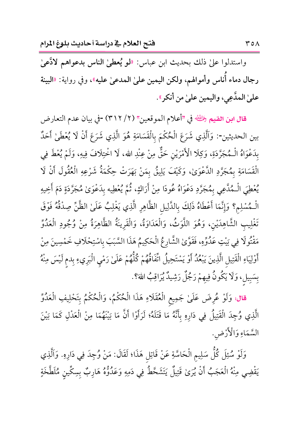قال ابن القيم -رحمه الله- في «أعلام الموقعين» (٢/ ٣١٢) في بيان عدم التعارض بين الحديثين: وَاَلَّذِي شَرَعَ الْحُكْمَ بِالْقَسَامَةِ هُوَ الَّذِي شَرَعَ أَنْ لَا يُعْطَى أَحَدٌ بِدَعْوَاهُ الْمُجَرَّدَةِ، وَكِلَا الْأَمْرَيْنِ حَقٌّ مِنْ عِنْدِ الله، لَا اخْتِلَافَ فِيهِ، وَلَمْ يُعْطَ فِي الْقَسَامَةِ بِمُجَرَّدِ الدَّعْوَى، وَكَيْفَ يَلِيقُ بِمَنْ بَهَرَتْ حِكْمَةُ شَرْعِهِ الْعُقُولَ أَنْ لَا يُعْطِيَ الْمُدَّعِي بِمُجَرَّدِ دَعْوَاهُ عُودًا مِنْ أَرَاكٍ، ثُمَّ يُعْطِيه بِدَعْوَى مُجَرَّدَةٍ دَمَ أَخِيهِ الْمُسْلِمِ؟ وَإِنَّمَا أَعْطَاهُ ذَلِكَ بِالدَّلِيلِ الظَّاهِرِ الَّذِي يَغْلِبُ عَلَى الظَّنِّ صِدْقُهُ فَوْقَ تَغْلِيبِ الشَّاهِدَيْنِ، وَهُوَ اللَّوَثُ، وَالْعَدَاوَةُ، وَالْقَرِينَةُ الظَّاهِرَةُ مِنْ وُجُودِ الْعَدُوِّ مَقْتُولًا فِي بَيْتِ عَدُوِّهِ، فَقَوَّى الشَّارِعُ الْحَكِيمُ هَذَا السَّبَبَ بِاسْتِحْلَافِ خَمْسِينَ مِنْ أَوْلِيَاءِ الْقَتِيلِ الَّذِينَ يَبْعُدُ أَوْ يَسْتَحِيلُ اتِّفَاقُهُمْ كُلُّهُمْ عَلَى رَمْيِ الْبَرِيءِ بِدمٍ لَيْسَ مِنْهُ بِسَبِيلٍ، وَلَا يَكُونُ فِيهِمْ رَجُلٌ رَشِيدٌ يُرَاقِبُ اللهَ؟.
