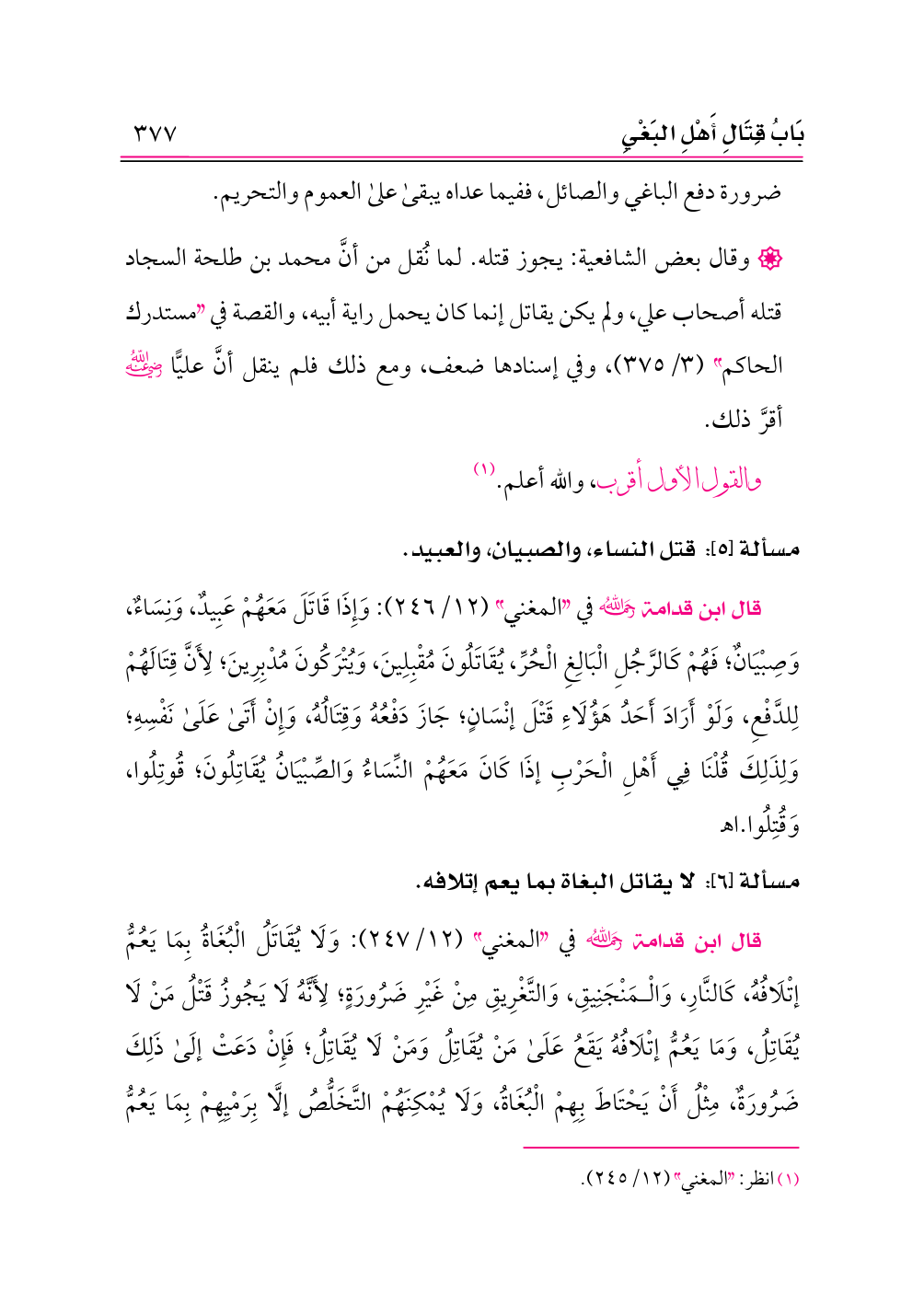 • وقال بعض الشافعية: يجوز قتله. لما نُقل من أنَّ محمد بن طلحة السجاد قتله أصحاب علي، ولم يكن يقاتل إنما كان يحمل راية أبيه، والقصة في «مستدرك الحاكم» (٣/ ٣٧٥)، وفي إسنادها ضعف، ومع ذلك فلم ينقل أنَّ عليًّا -رضي الله عنه- أقرَّ ذلك.