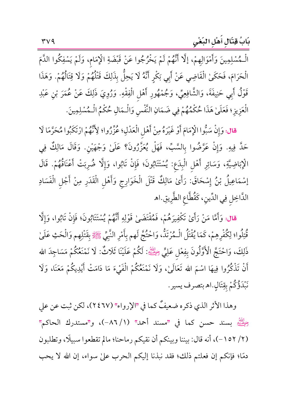 وهذا الأثر الذي ذكره ضعيفٌ كما في «الإرواء» (٢٤٦٧)، لكن ثبت عن علي -رضي الله عنه- بسند حسن كما في «مسند أحمد» (١/ ٨٦ - )، و «مستدرك الحاكم» (٢/ ١٥٢ - )، أنه قال: بيننا وبينكم أن نقيكم رماحنا؛ مالم تقطعوا سبيلًا، وتطلبون دمًا؛ فإنكم إن فعلتم ذلك؛ فقد نبذنا إليكم الحرب على سواء، إن الله لا يحب