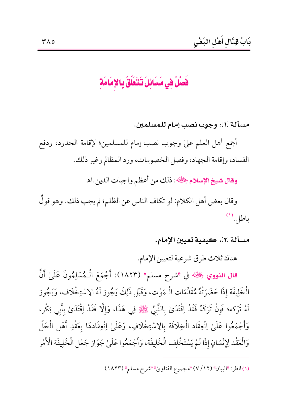 فَصْلٌ فِي مَسَائِلَ تَتَعَلّقُ بِالإِمَامَةِ