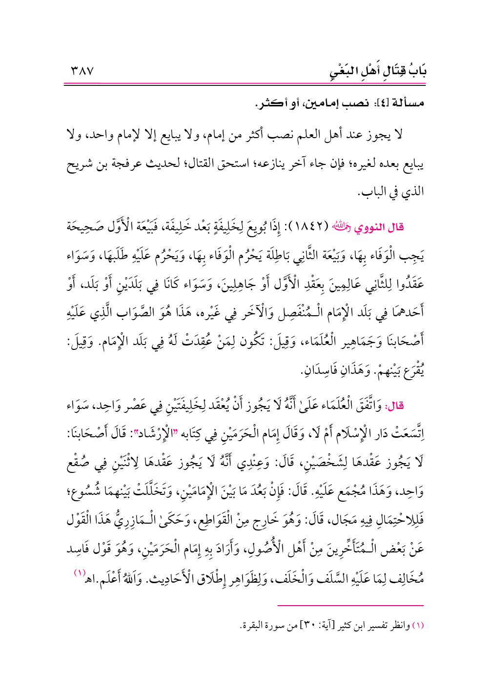 قال: وَاتَّفَقَ الْعُلَمَاء عَلَى أَنَّهُ لَا يَجُوز أَنْ يُعْقَد لِخَلِيفَتَيْنِ فِي عَصْر وَاحِد، سَوَاء اِتَّسَعَتْ دَار الْإِسْلَام أَمْ لَا، وَقَالَ إِمَام الْحَرَمَيْنِ فِي كِتَابه «الْإِرْشَاد»: قَالَ أَصْحَابنَا: لَا يَجُوز عَقْدهَا لِشَخْصَيْنِ، قَالَ: وَعِنْدِي أَنَّهُ لَا يَجُوز عَقْدهَا لِاثْنَيْنِ فِي صُقْع وَاحِد، وَهَذَا مُجْمَع عَلَيْهِ. قَالَ: فَإِنْ بَعُدَ مَا بَيْنَ الْإِمَامَيْنِ، وَتَخَلَّلَتْ بَيْنهمَا شُسُوع؛ فَلِلِاحْتِمَالِ فِيهِ مَجَال، قَالَ: وَهُوَ خَارِج مِنْ الْقَوَاطِع، وَحَكَى الْمَازِرِيُّ هَذَا الْقَوْل عَنْ بَعْض الْمُتَأَخِّرِينَ مِنْ أَهْل الْأُصُولِ، وَأَرَادَ بِهِ إِمَام الْحَرَمَيْنِ، وَهُوَ قَوْل فَاسِد مُخَالِف لِمَا عَلَيْهِ السَّلَف وَالْخَلَف، وَلِظَوَاهِر إِطْلَاق الْأَحَادِيث. وَاَللهُ أَعْلَم. اهـ (¬١)