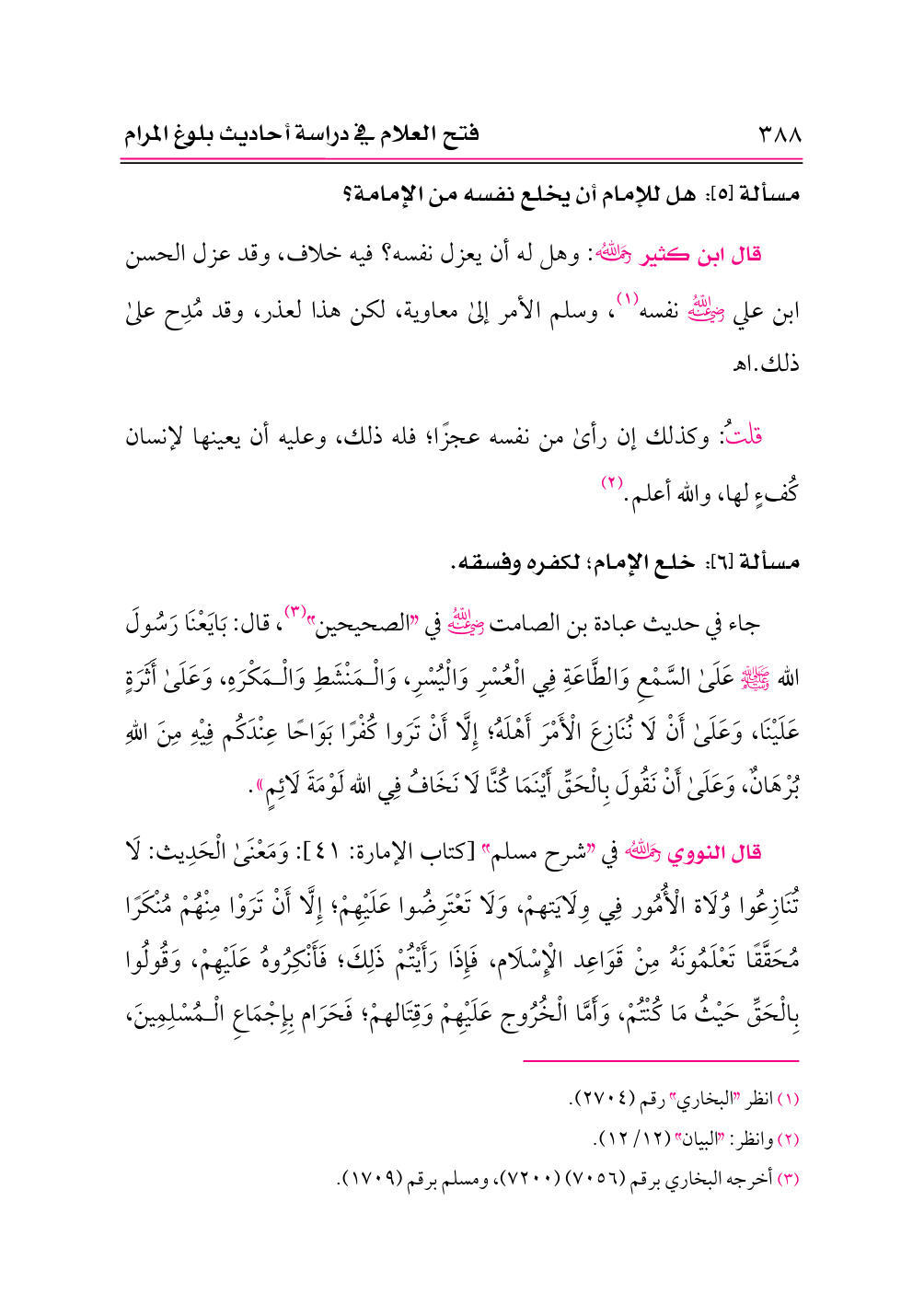 مسألة [٦]: خلع الإمام؛ لكفره وفسقه.