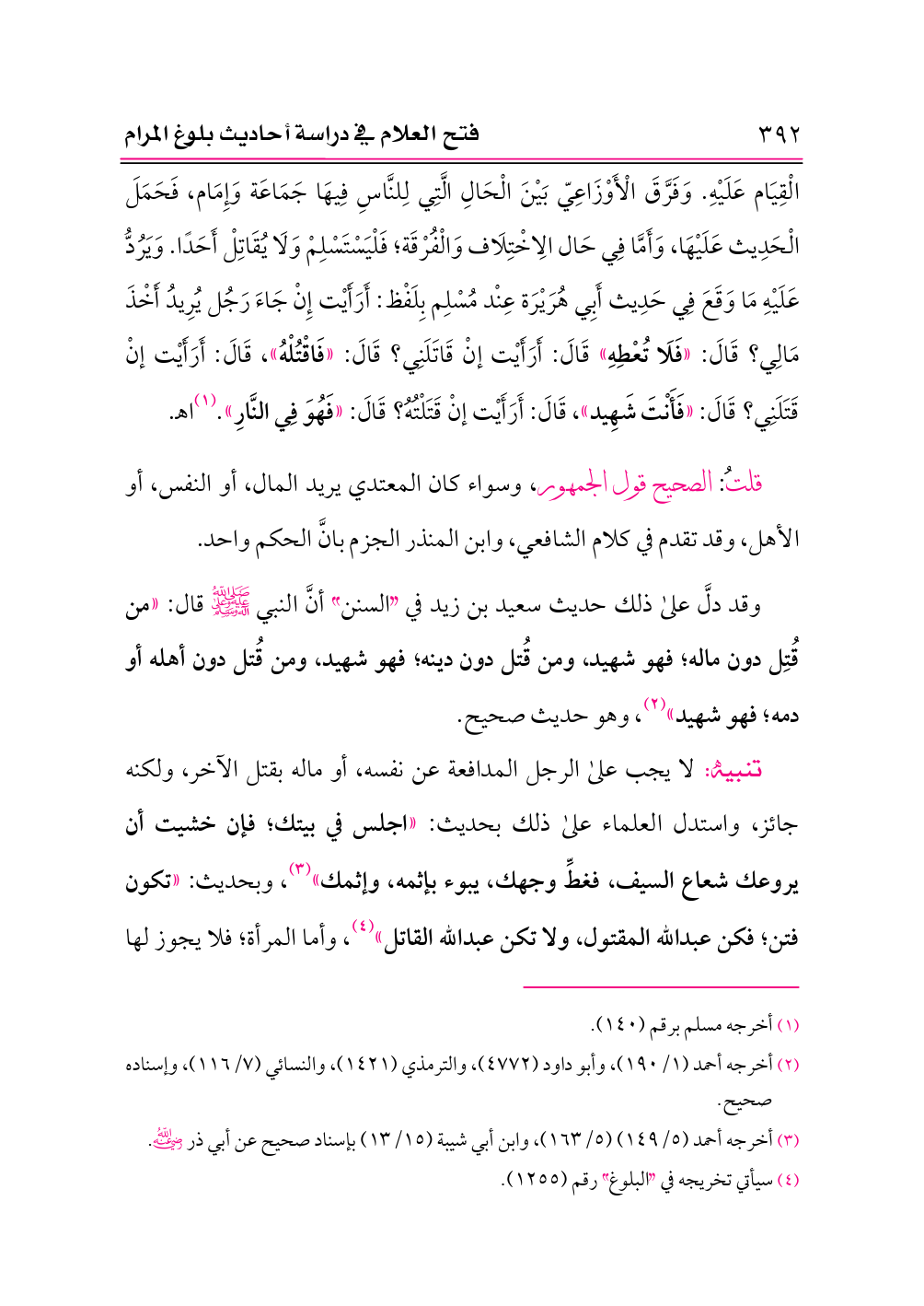 وَيَرُدُّ عَلَيْهِ مَا وَقَعَ فِي حَدِيث أَبِي هُرَيْرَة عِنْد مُسْلِم بِلَفْظ: أَرَأَيْت إِنْ جَاءَ رَجُل يُرِيدُ أَخْذَ مَالِي؟ قَالَ: «فَلَا تُعْطِهِ» قَالَ: أَرَأَيْت إنْ قَاتَلَنِي؟ قَالَ: «فَاقْتُلْهُ»، قَالَ: أَرَأَيْت إنْ قَتَلَنِي؟ قَالَ: «فَأَنْتَ شَهِيد»، قَالَ: أَرَأَيْت إنْ قَتَلْتُهُ؟ قَالَ: «فَهُوَ فِي النَّارِ». (¬١) اهـ.