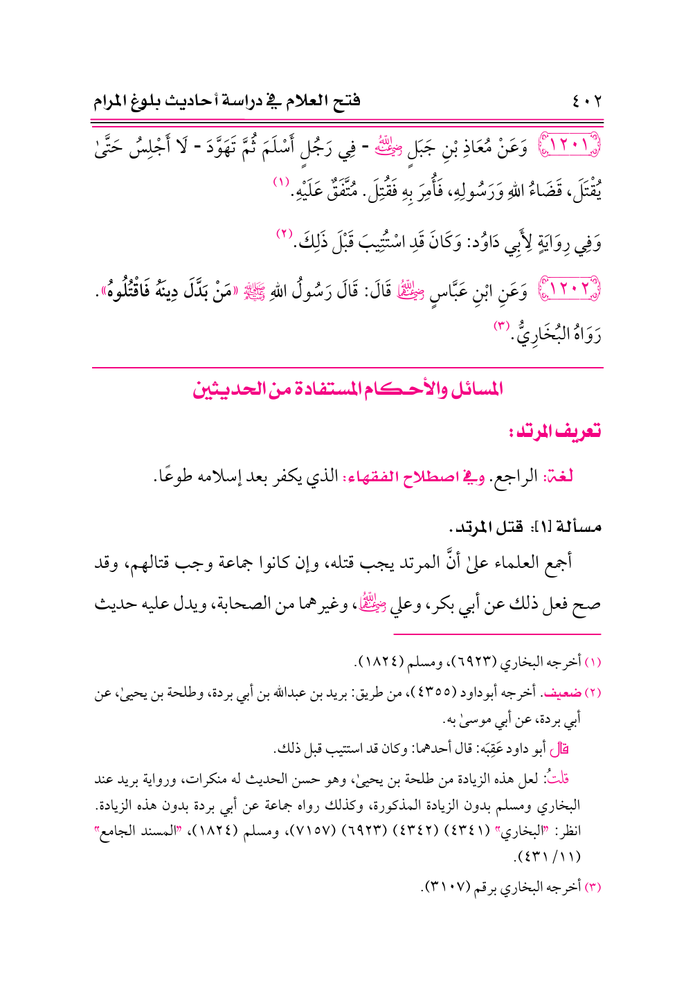 ١٢٠٢ - وَعَنِ ابْنِ عَبَّاسٍ -رضي الله عنهما- قَالَ: قَالَ رَسُولُ اللهِ - صلى الله عليه وسلم - «مَنْ بَدَّلَ دِينَهُ فَاقْتُلُوهُ». رَوَاهُ البُخَارِيُّ. (¬٣)