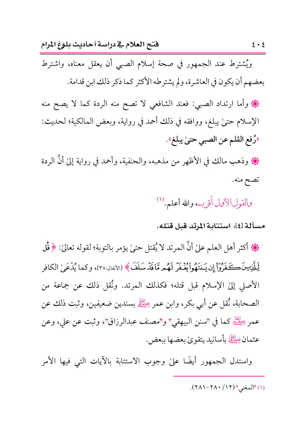• أكثر أهل العلم على أنَّ المرتد لا يُقتل حتى يؤمر بالتوبة؛ لقوله تعالى: {قُلْ لِلَّذِينَ كَفَرُوا إِنْ يَنْتَهُوا يُغْفَرْ لَهُمْ مَا قَدْ سَلَفَ} [الأنفال:٣٨]، وكما يُدْعَى الكافر الأصلي إلى الإسلام قبل قتله؛ فكذلك المرتد. ونُقل ذلك عن جماعة من الصحابة، نُقل عن أبي بكر، وابن عمر -رضي الله عنهم- بسندين ضعيفين، وثبت ذلك عن عمر -رضي الله عنه- كما في «سنن البيهقي» و «مصنف عبدالرزاق»، وثبت عن علي، وعن عثمان -رضي الله عنهما- بأسانيد يتقوى بعضها ببعض.