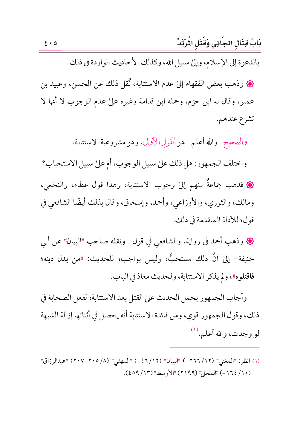 وأجاب الجمهور بحمل الحديث على القتل بعد الاستتابة؛ لفعل الصحابة في ذلك، وقول الجمهور قوي، ومن فائدة الاستتابة أنه يحصل في أثنائها إزالة الشبهة لو وجدت، والله أعلم. (¬١)
