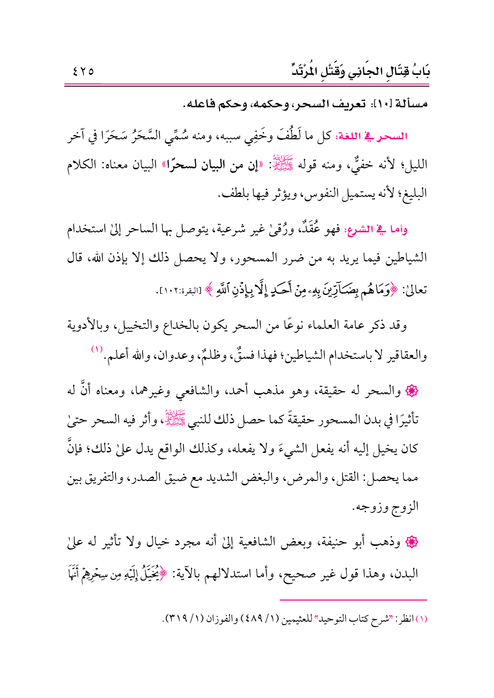 مسألة [١٠]: تعريف السحر، وحكمه، وحكم فاعله.
