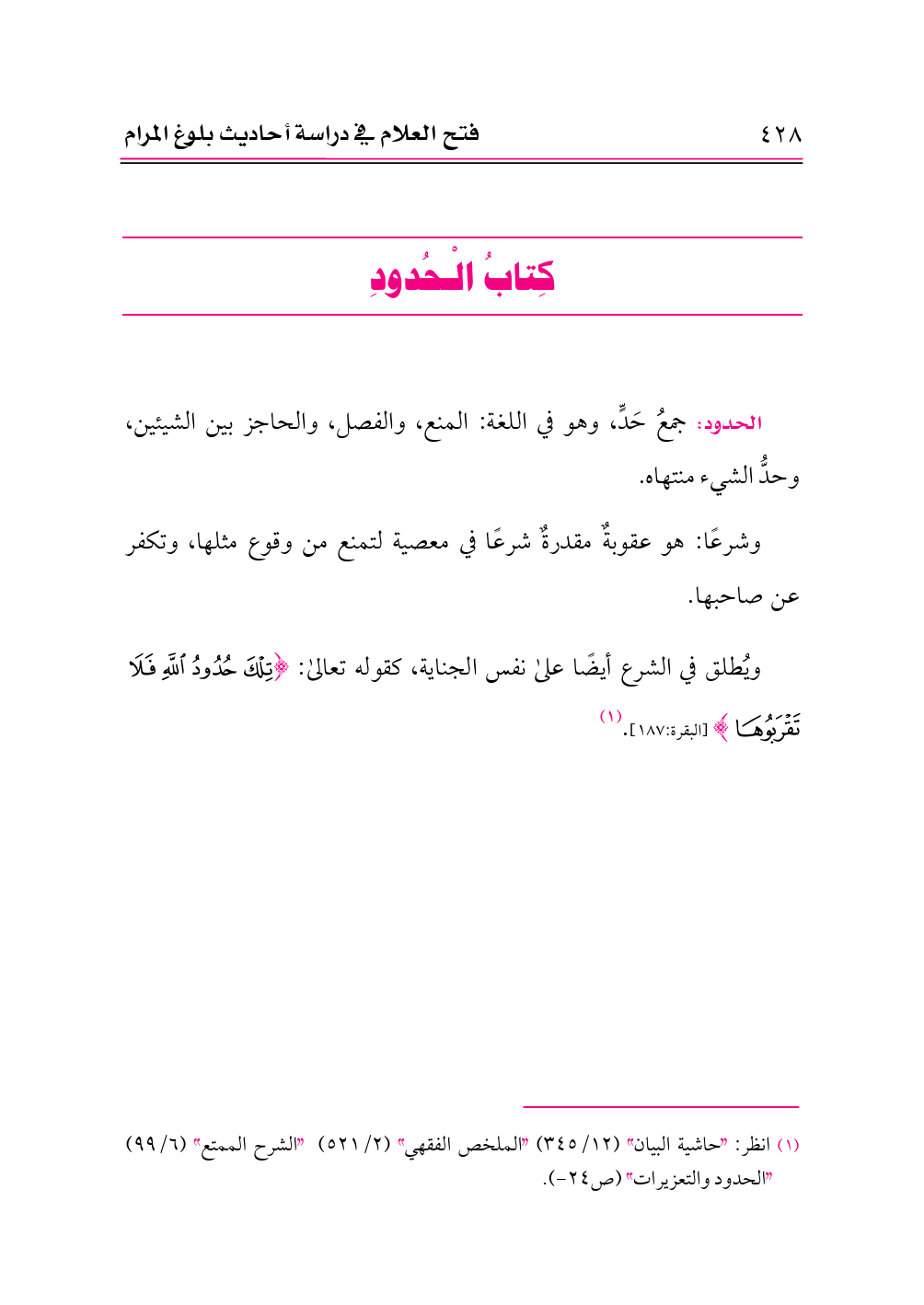 ويُطلق في الشرع أيضًا على نفس الجناية، كقوله تعالى: {تِلْكَ حُدُودُ اللَّهِ فَلَا تَقْرَبُوهَا} [البقرة:١٨٧]. (¬١)