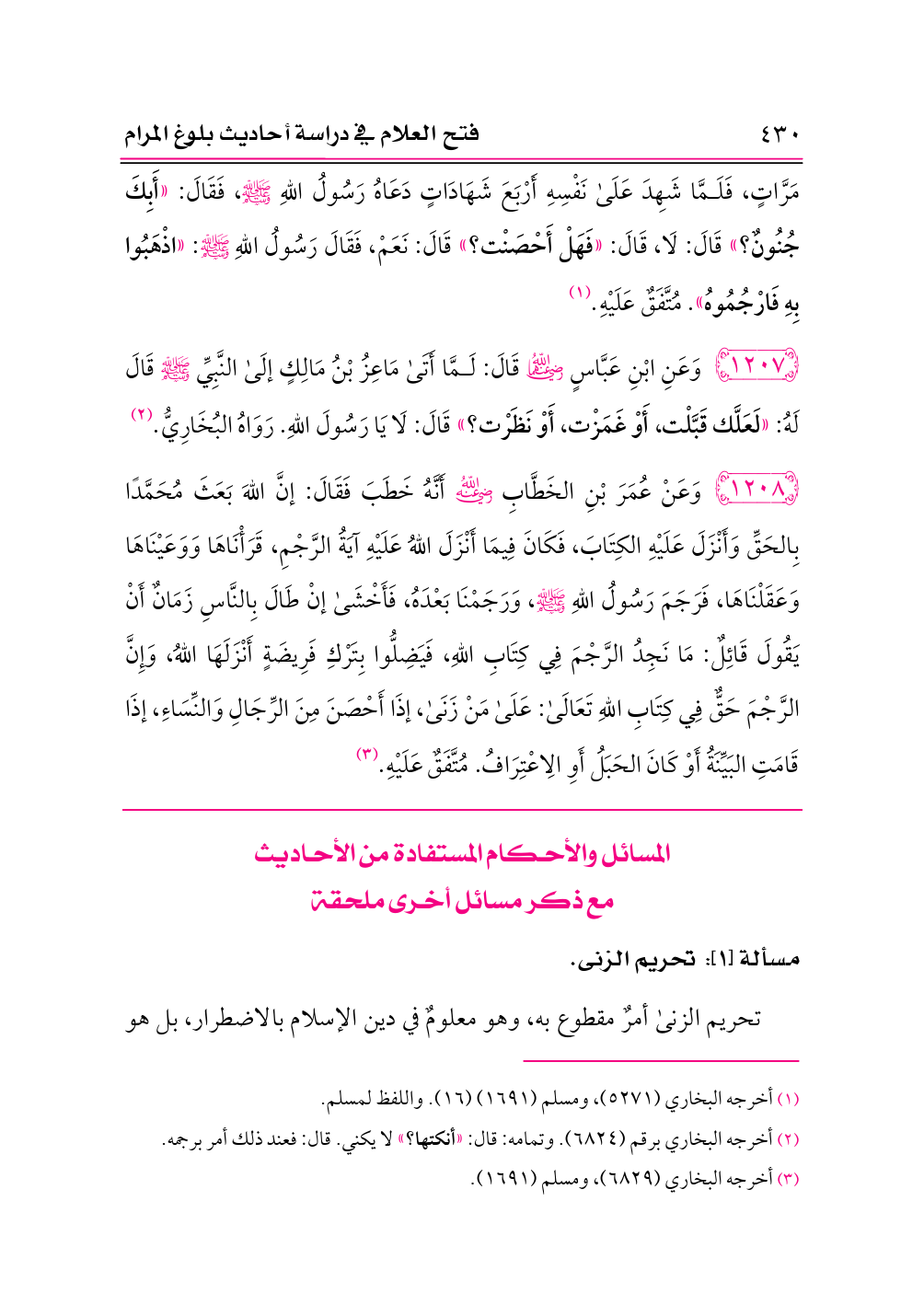 ١٢٠٨ - وَعَنْ عُمَرَ بْنِ الخَطَّابِ -رضي الله عنه- أَنَّهُ خَطَبَ فَقَالَ: إنَّ اللهَ بَعَثَ مُحَمَّدًا بِالحَقِّ وَأَنْزَلَ عَلَيْهِ الكِتَابَ، فَكَانَ فِيمَا أَنْزَلَ اللهُ عَلَيْهِ آيَةُ الرَّجْمِ، قَرَأْنَاهَا وَوَعَيْنَاهَا وَعَقَلْنَاهَا، فَرَجَمَ رَسُولُ اللهِ - صلى الله عليه وسلم -، وَرَجَمْنَا بَعْدَهُ، فَأَخْشَى إنْ طَالَ بِالنَّاسِ زَمَانٌ أَنْ يَقُولَ قَائِلٌ: مَا نَجِدُ الرَّجْمَ فِي كِتَابِ اللهِ، فَيَضِلُّوا بِتَرْكِ فَرِيضَةٍ أَنْزَلَهَا اللهُ، وَإِنَّ الرَّجْمَ حَقٌّ فِي كِتَابِ اللهِ تَعَالَى: عَلَى مَنْ زَنَى، إذَا أَحْصَنَ مِنَ الرِّجَالِ وَالنِّسَاءِ، إذَا قَامَتِ البَيِّنَةُ أَوْ كَانَ الحَبَلُ أَوِ الِاعْتِرَافُ. مُتَّفَقٌ عَلَيْهِ. (¬٣)