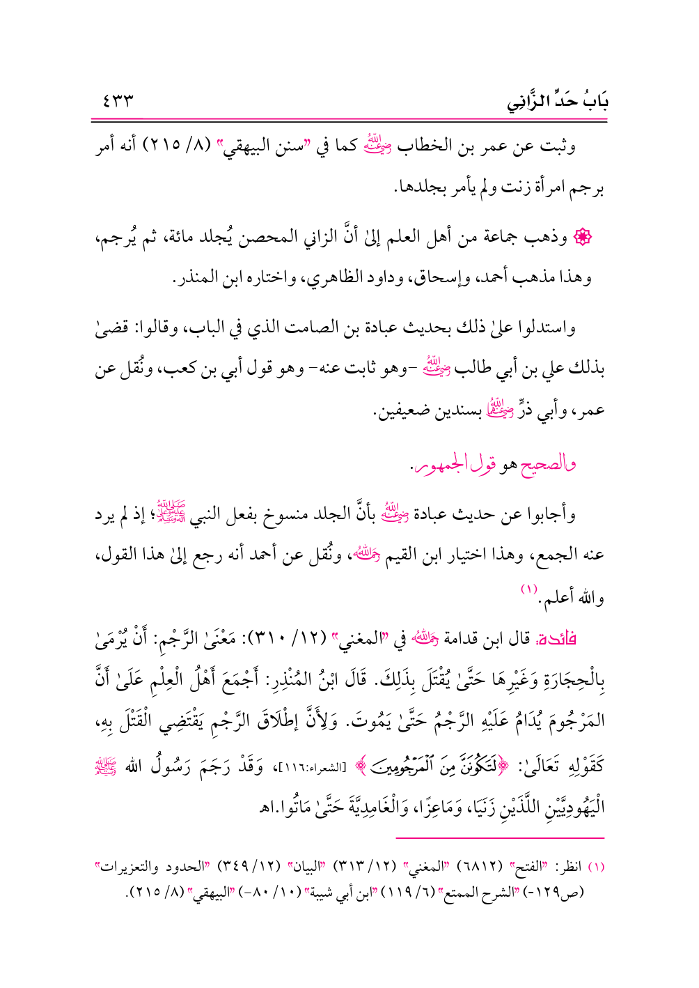 وأجابوا عن حديث عبادة -رضي الله عنه- بأنَّ الجلد منسوخ بفعل النبي -صلى الله عليه وعلى آله وسلم-؛ إذ لم يرد عنه الجمع، وهذا اختيار ابن القيم -رحمه الله-، ونُقل عن أحمد أنه رجع إلى هذا القول، والله أعلم. (¬١)