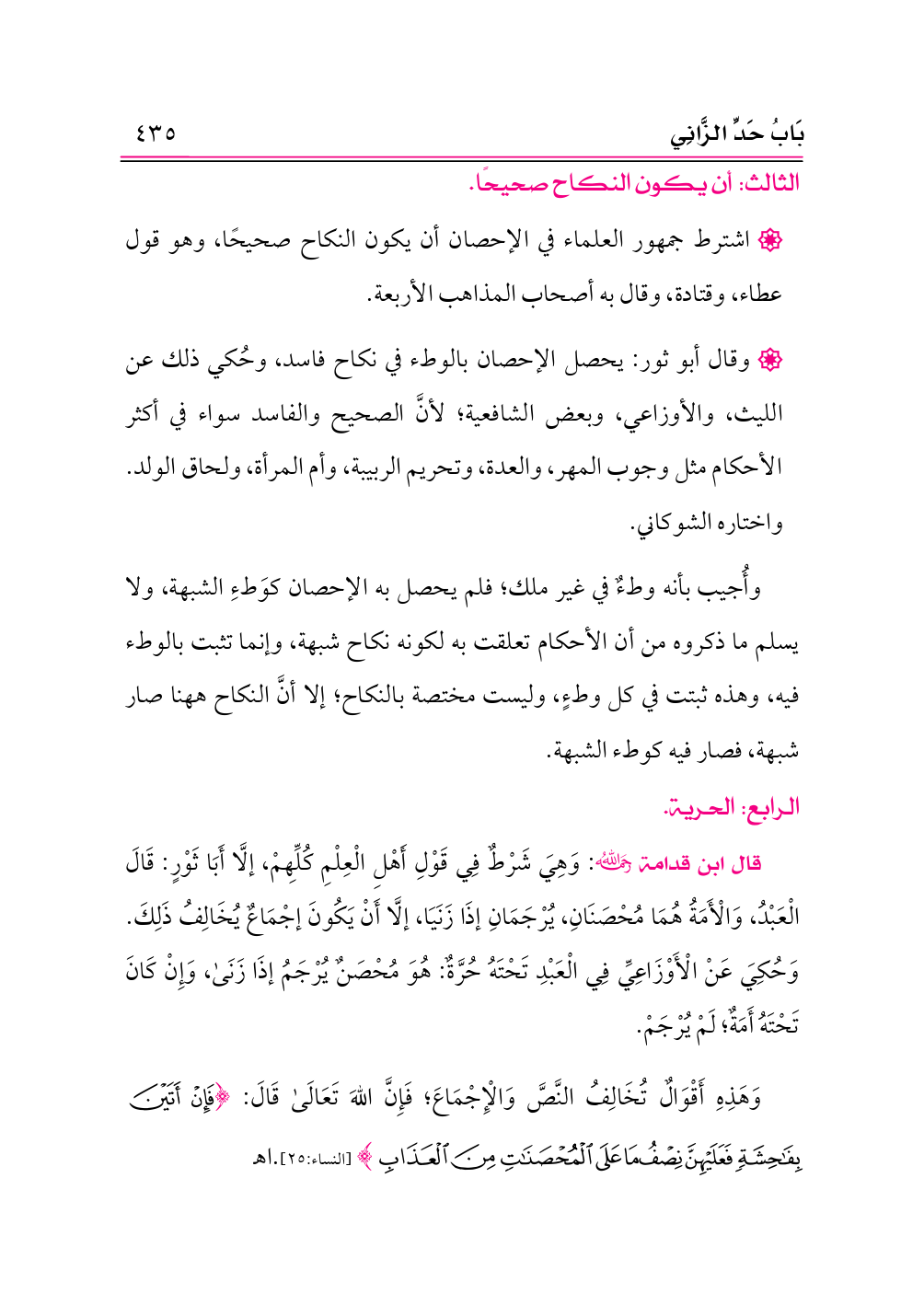 قال ابن قدامة -رحمه الله-: وَهِيَ شَرْطٌ فِي قَوْلِ أَهْلِ الْعِلْمِ كُلِّهِمْ، إلَّا أَبَا ثَوْرٍ: قَالَ الْعَبْدُ، وَالْأَمَةُ هُمَا مُحْصَنَانِ، يُرْجَمَانِ إذَا زَنَيَا، إلَّا أَنْ يَكُونَ إجْمَاعٌ يُخَالِفُ ذَلِكَ. وَحُكِيَ عَنْ الْأَوْزَاعِيِّ فِي الْعَبْدِ تَحْتَهُ حُرَّةٌ: هُوَ مُحْصَنٌ يُرْجَمُ إذَا زَنَى، وَإِنْ كَانَ تَحْتَهُ أَمَةٌ؛ لَمْ يُرْجَمْ.