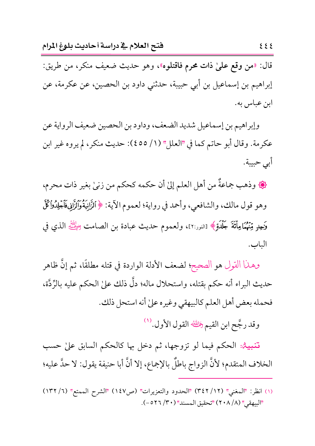 قال: «من وقع على ذات محرم فاقتلوه»، وهو حديث ضعيف منكر، من طريق: إبراهيم بن إسماعيل بن أبي حبيبة، حدثني داود بن الحصين، عن عكرمة، عن ابن عباس به.