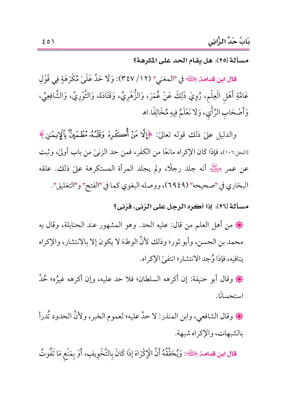 مسألة [٢٥]: هل يقام الحد على المكرهة؟