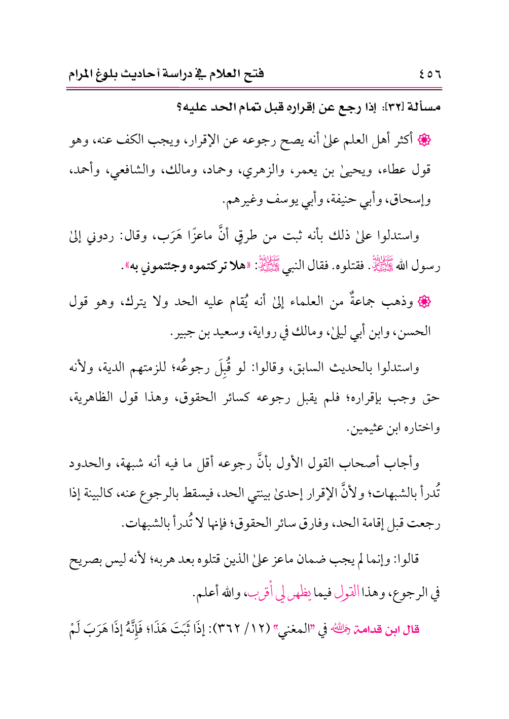 وأجاب أصحاب القول الأول بأنَّ رجوعه أقل ما فيه أنه شبهة، والحدود تُدرأ بالشبهات؛ ولأنَّ الإقرار إحدى بينتي الحد، فيسقط بالرجوع عنه، كالبينة إذا رجعت قبل إقامة الحد، وفارق سائر الحقوق؛ فإنها لا تُدرأ بالشبهات.