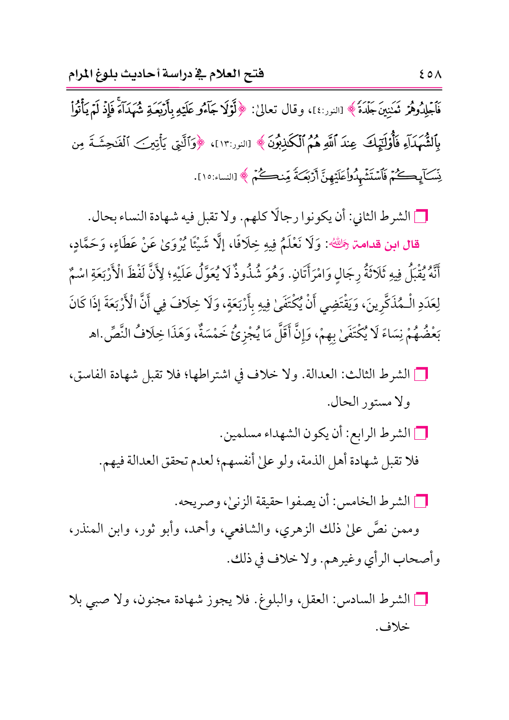 فَاجْلِدُوهُمْ ثَمَانِينَ جَلْدَةً} [النور:٤]، وقال تعالى: {لَوْلَا جَاءُوا عَلَيْهِ بِأَرْبَعَةِ شُهَدَاءَ فَإِذْ لَمْ يَأْتُوا بِالشُّهَدَاءِ فَأُولَئِكَ عِنْدَ اللَّهِ هُمُ الْكَاذِبُونَ} [النور:١٣]، {وَاللَّاتِي يَأْتِينَ الْفَاحِشَةَ مِنْ نِسَائِكُمْ فَاسْتَشْهِدُوا عَلَيْهِنَّ أَرْبَعَةً مِنْكُمْ} [النساء:١٥].