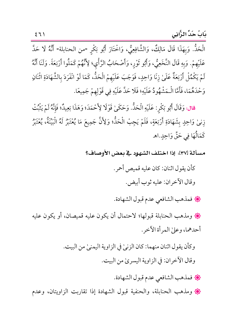 • ومذهب الحنابلة، والحنفية قبول الشهادة إذا تقاربت الزاويتان، وعدم