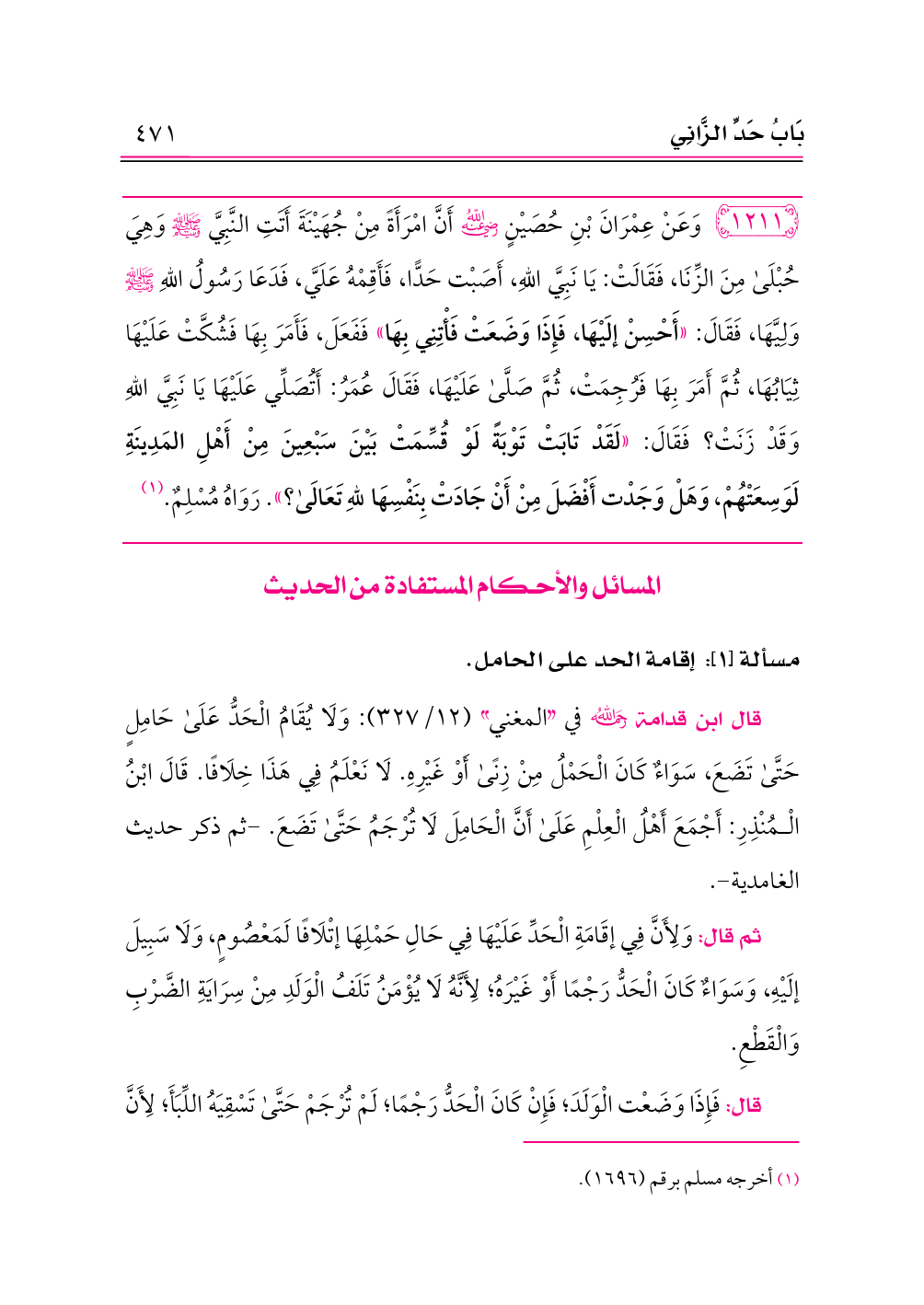 ١٢١١ - وَعَنْ عِمْرَانَ بْنِ حُصَيْنٍ -رضي الله عنه- أَنَّ امْرَأَةً مِنْ جُهَيْنَةَ أَتَتِ النَّبِيَّ - صلى الله عليه وسلم - وَهِيَ حُبْلَى مِنَ الزِّنَا، فَقَالَتْ: يَا نَبِيَّ اللهِ، أَصَبْت حَدًّا، فَأَقِمْهُ عَلَيَّ، فَدَعَا رَسُولُ اللهِ - صلى الله عليه وسلم - وَلِيَّهَا، فَقَالَ: «أَحْسِنْ إلَيْهَا، فَإِذَا وَضَعَتْ فَأْتِنِي بِهَا» فَفَعَلَ، فَأَمَرَ بِهَا فَشُكَّتْ عَلَيْهَا ثِيَابُهَا، ثُمَّ أَمَرَ بِهَا فَرُجِمَتْ، ثُمَّ صَلَّى عَلَيْهَا، فَقَالَ عُمَرُ: أَتُصَلِّي عَلَيْهَا يَا نَبِيَّ اللهِ وَقَدْ زَنَتْ؟ فَقَالَ: «لَقَدْ تَابَتْ تَوْبَةً لَوْ قُسِّمَتْ بَيْنَ سَبْعِينَ مِنْ أَهْلِ المَدِينَةِ لَوَسِعَتْهُمْ، وَهَلْ وَجَدْت أَفْضَلَ مِنْ أَنْ جَادَتْ بِنَفْسِهَا للهِ تَعَالَى؟». رَوَاهُ مُسْلِمٌ. (¬١)