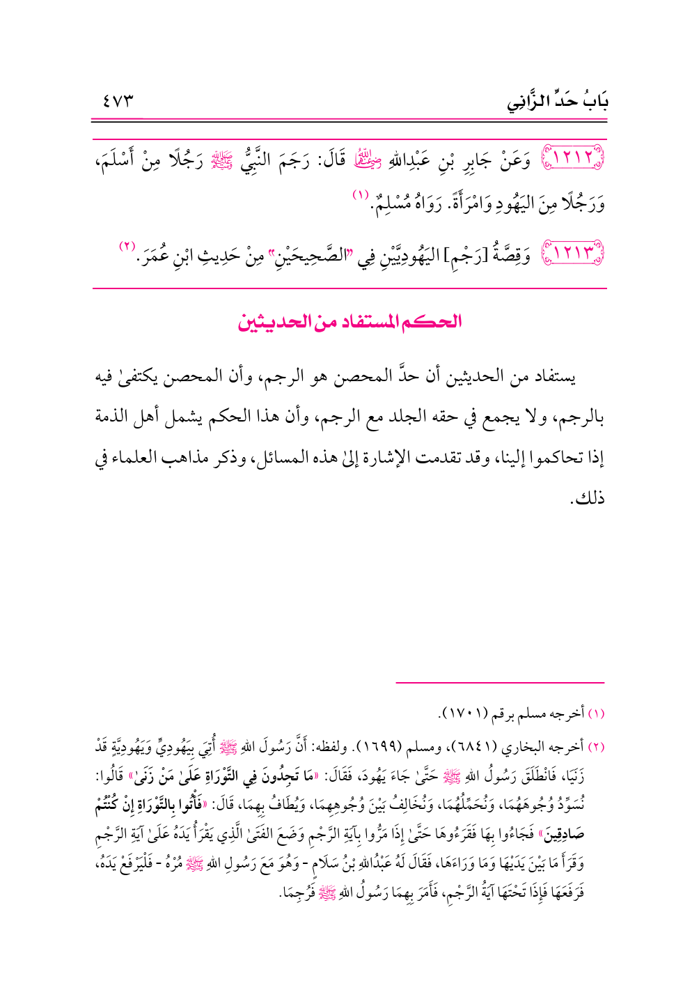 (¬٢) أخرجه البخاري (٦٨٤١)، ومسلم (١٦٩٩). ولفظه: أَنَّ رَسُولَ اللهِ - صلى الله عليه وسلم - أُتِيَ بِيَهُودِيٍّ وَيَهُودِيَّةٍ قَدْ زَنَيَا، فَانْطَلَقَ رَسُولُ اللهِ - صلى الله عليه وسلم - حَتَّى جَاءَ يَهُودَ، فَقَالَ: «مَا تَجِدُونَ فِي التَّوْرَاةِ عَلَى مَنْ زَنَى» قَالُوا: نُسَوِّدُ وُجُوهَهُمَا، وَنُحَمِّلُهُمَا، وَنُخَالِفُ بَيْنَ وُجُوهِهِمَا، وَيُطَافُ بِهِمَا، قَالَ: «فَأْتُوا بِالتَّوْرَاةِ إِنْ كُنْتُمْ صَادِقِينَ» فَجَاءُوا بِهَا فَقَرَءُوهَا حَتَّى إِذَا مَرُّوا بِآيَةِ الرَّجْمِ وَضَعَ الفَتَى الَّذِي يَقْرَأُ يَدَهُ عَلَى آيَةِ الرَّجْمِ وَقَرَأَ مَا بَيْنَ يَدَيْهَا وَمَا وَرَاءَهَا، فَقَالَ لَهُ عَبْدُاللهِ بْنُ سَلَامٍ وَهُوَ مَعَ رَسُولِ اللهِ - صلى الله عليه وسلم - مُرْهُ فَلْيَرْفَعْ يَدَهُ، فَرَفَعَهَا فَإِذَا تَحْتَهَا آيَةُ الرَّجْمِ، فَأَمَرَ بِهِمَا رَسُولُ اللهِ - صلى الله عليه وسلم - فَرُجِمَا.