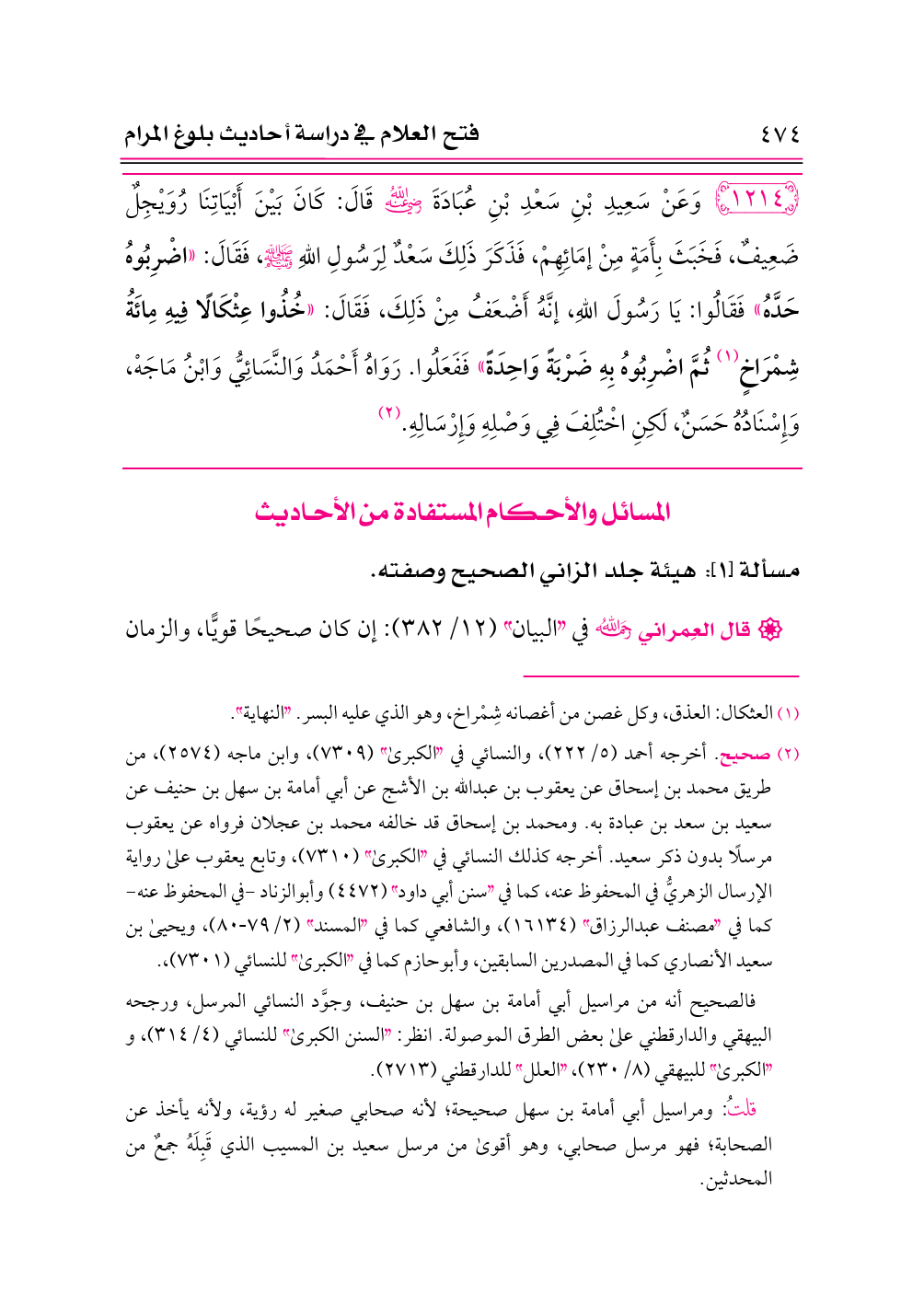 (¬٢) صحيح. أخرجه أحمد (٥/ ٢٢٢)، والنسائي في «الكبرى» (٧٣٠٩)، وابن ماجه (٢٥٧٤)، من طريق محمد بن إسحاق عن يعقوب بن عبدالله بن الأشج عن أبي أمامة بن سهل بن حنيف عن سعيد بن سعد بن عبادة به. ومحمد بن إسحاق قد خالفه محمد بن عجلان فرواه عن يعقوب مرسلًا بدون ذكر سعيد. أخرجه كذلك النسائي في «الكبرى» (٧٣١٠)، وتابع يعقوب على رواية الإرسال الزهريُّ في المحفوظ عنه، كما في «سنن أبي داود» (٤٤٧٢) وأبوالزناد -في المحفوظ عنه- كما في «مصنف عبدالرزاق» (١٦١٣٤)، والشافعي كما في «المسند» (٢/ ٧٩ - ٨٠)، ويحيى بن سعيد الأنصاري كما في المصدرين السابقين، وأبوحازم كما في «الكبرى» للنسائي (٧٣٠١)،.