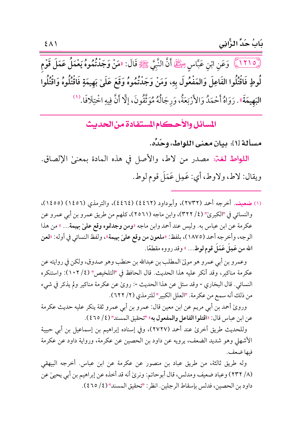 ١٢١٥ - وَعَنِ ابْنِ عَبَّاسٍ -رضي الله عنهما- أَنَّ النَّبِيَّ - صلى الله عليه وسلم - قَالَ: «مَنْ وَجَدْتُمُوهُ يَعْمَلُ عَمَلَ قَوْمِ لُوطٍ فَاقْتُلُوا الفَاعِلَ وَالمَفْعُولَ بِهِ، وَمَنْ وَجَدْتُمُوهُ وَقَعَ عَلَى بَهِيمَةٍ فَاقْتُلُوهُ وَاقْتُلُوا البَهِيمَةَ». رَوَاهُ أَحْمَدُ وَالأَرْبَعَةُ، وَرِجَالُهُ مُوَثَّقُونَ، إلَّا أَنَّ فِيهِ اخْتِلَافًا. (¬١)