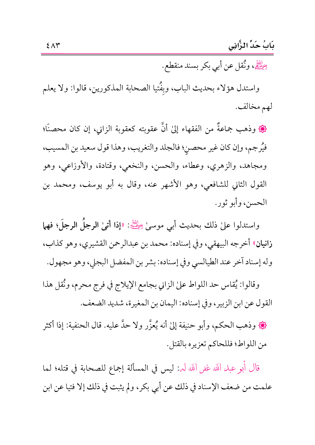 واستدلوا على ذلك بحديث أبي موسى -رضي الله عنه-: «إذا أتى الرجلُ الرجلَ؛ فهما زانيان» أخرجه البيهقي، وفي إسناده: محمد بن عبدالرحمن القشيري، وهو كذاب، وله إسناد آخر عند الطيالسي وفي إسناده: بشر بن المفضل البجلي، وهو مجهول.