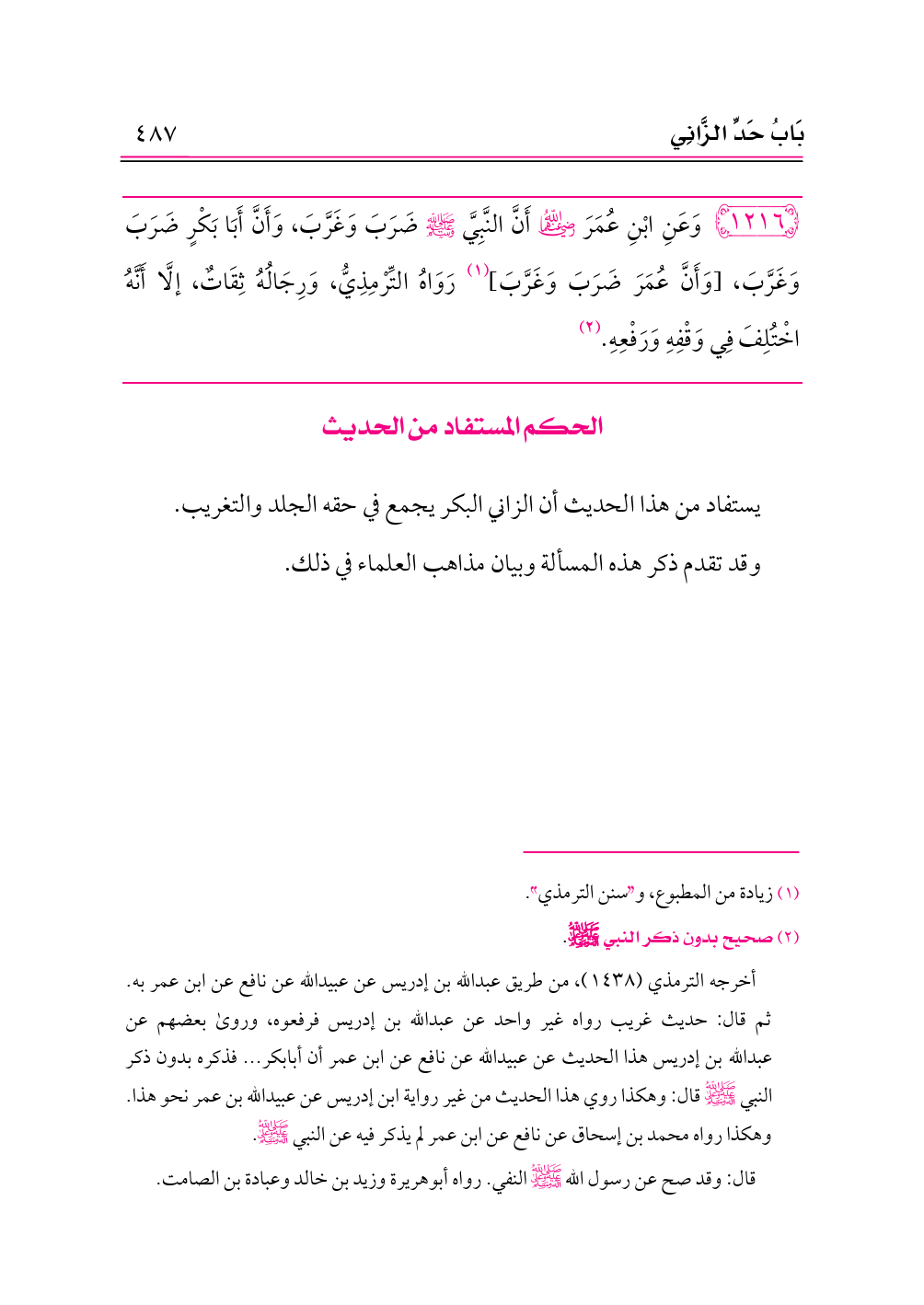 ١٢١٦ - وَعَنِ ابْنِ عُمَرَ -رضي الله عنهما- أَنَّ النَّبِيَّ - صلى الله عليه وسلم - ضَرَبَ وَغَرَّبَ، وَأَنَّ أَبَا بَكْرٍ ضَرَبَ وَغَرَّبَ، [وَأَنَّ عُمَرَ ضَرَبَ وَغَرَّبَ] (¬١) رَوَاهُ التِّرْمِذِيُّ، وَرِجَالُهُ ثِقَاتٌ، إلَّا أَنَّهُ اخْتُلِفَ فِي وَقْفِهِ وَرَفْعِهِ. (¬٢)