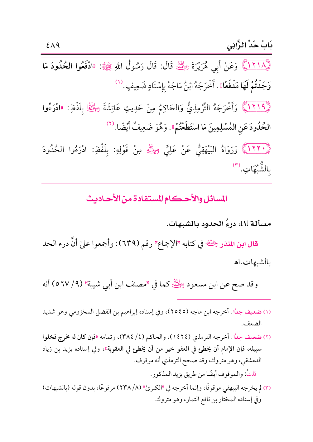 قال ابن المنذر -رحمه الله- في كتابه «الإجماع» رقم (٦٣٩): وأجمعوا على أنَّ درء الحد بالشبهات. اهـ