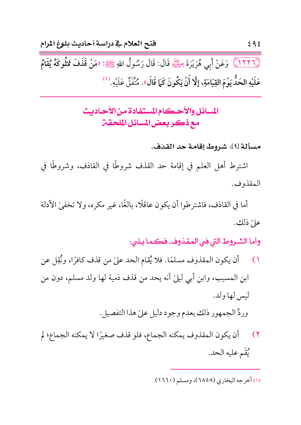 ١٢٢٦ - وَعَنْ أَبِي هُرَيْرَةَ -رضي الله عنه- قَالَ: قَالَ رَسُولُ اللهِ - صلى الله عليه وسلم -: «مَنْ قَذَفَ مَمْلُوكَهُ يُقَامُ عَلَيْهِ الحَدُّ يَوْمَ القِيَامَةِ، إلَّا أَنْ يَكُونَ كَمَا قَالَ». مُتَّفَقٌ عَلَيْهِ. (¬١)