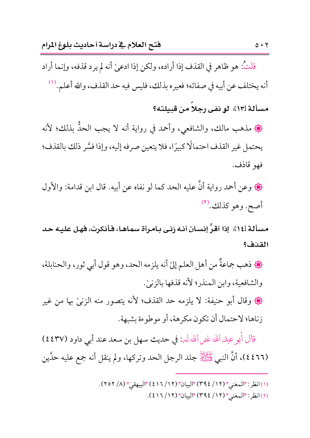 • وعن أحمد رواية أنَّ عليه الحد كما لو نفاه عن أبيه. قال ابن قدامة: والأول أصح. وهو كذلك. (¬٢)