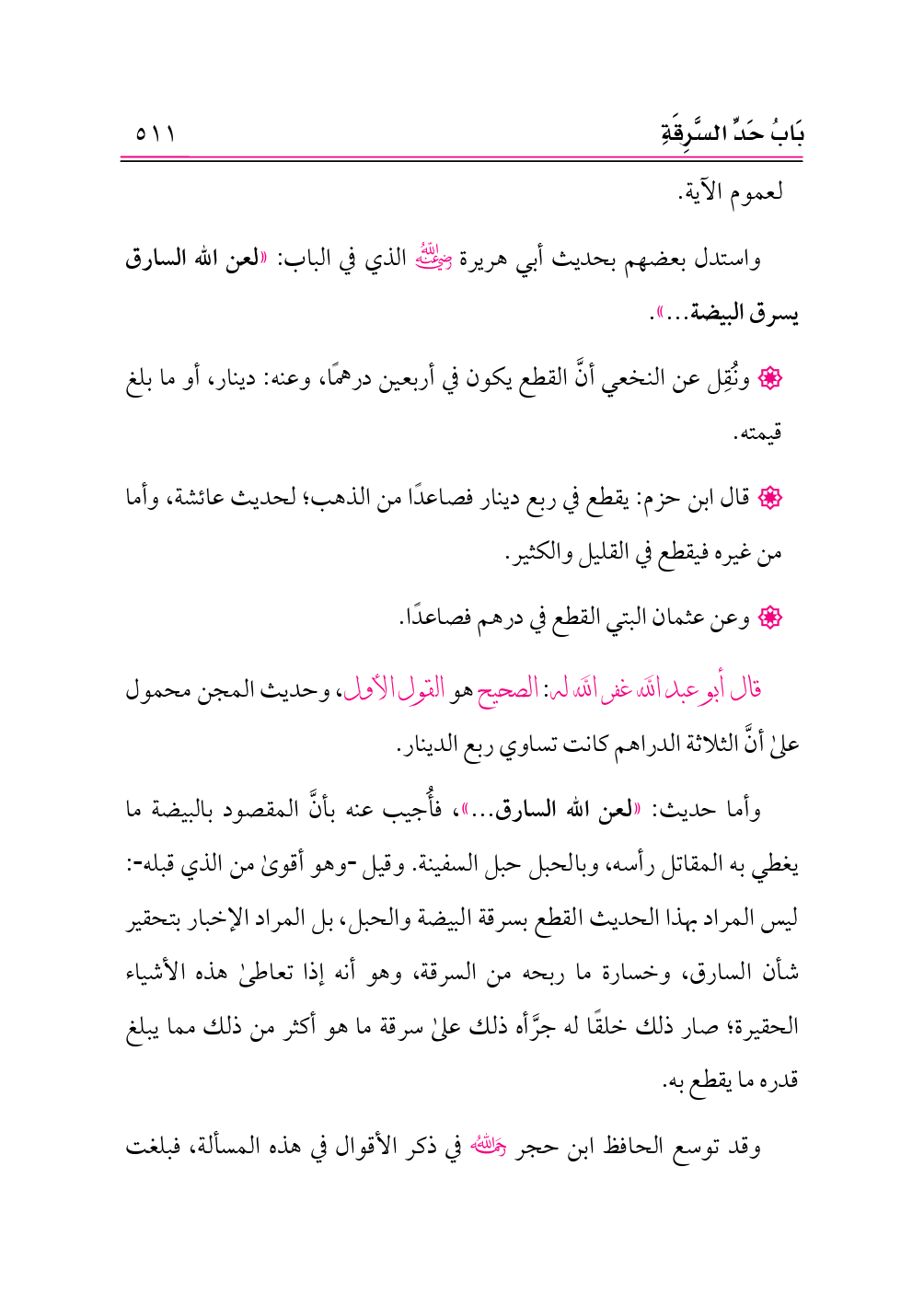 وأما حديث: «لعن الله السارق ... »، فأُجيب عنه بأنَّ المقصود بالبيضة ما يغطي به المقاتل رأسه، وبالحبل حبل السفينة. وقيل وهو أقوى من الذي قبله: ليس المراد بهذا الحديث القطع بسرقة البيضة والحبل، بل المراد الإخبار بتحقير شأن السارق، وخسارة ما ربحه من السرقة، وهو أنه إذا تعاطى هذه الأشياء الحقيرة؛ صار ذلك خلقًا له جرَّأه ذلك على سرقة ما هو أكثر من ذلك مما يبلغ قدره ما يقطع به.