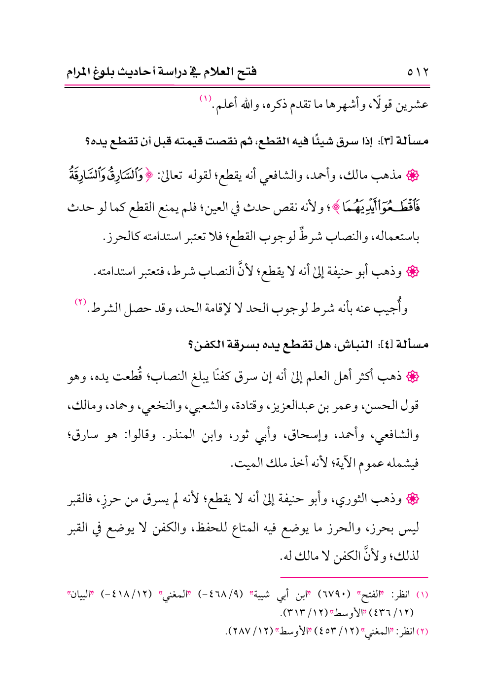 (¬١) انظر: «الفتح» (٦٧٩٠) «ابن أبي شيبة» (٩/ ٤٦٨ - ) «المغني» (١٢/ ٤١٨ - ) «البيان» (١٢/ ٤٣٦) «الأوسط» (١٢/ ٣١٣).
