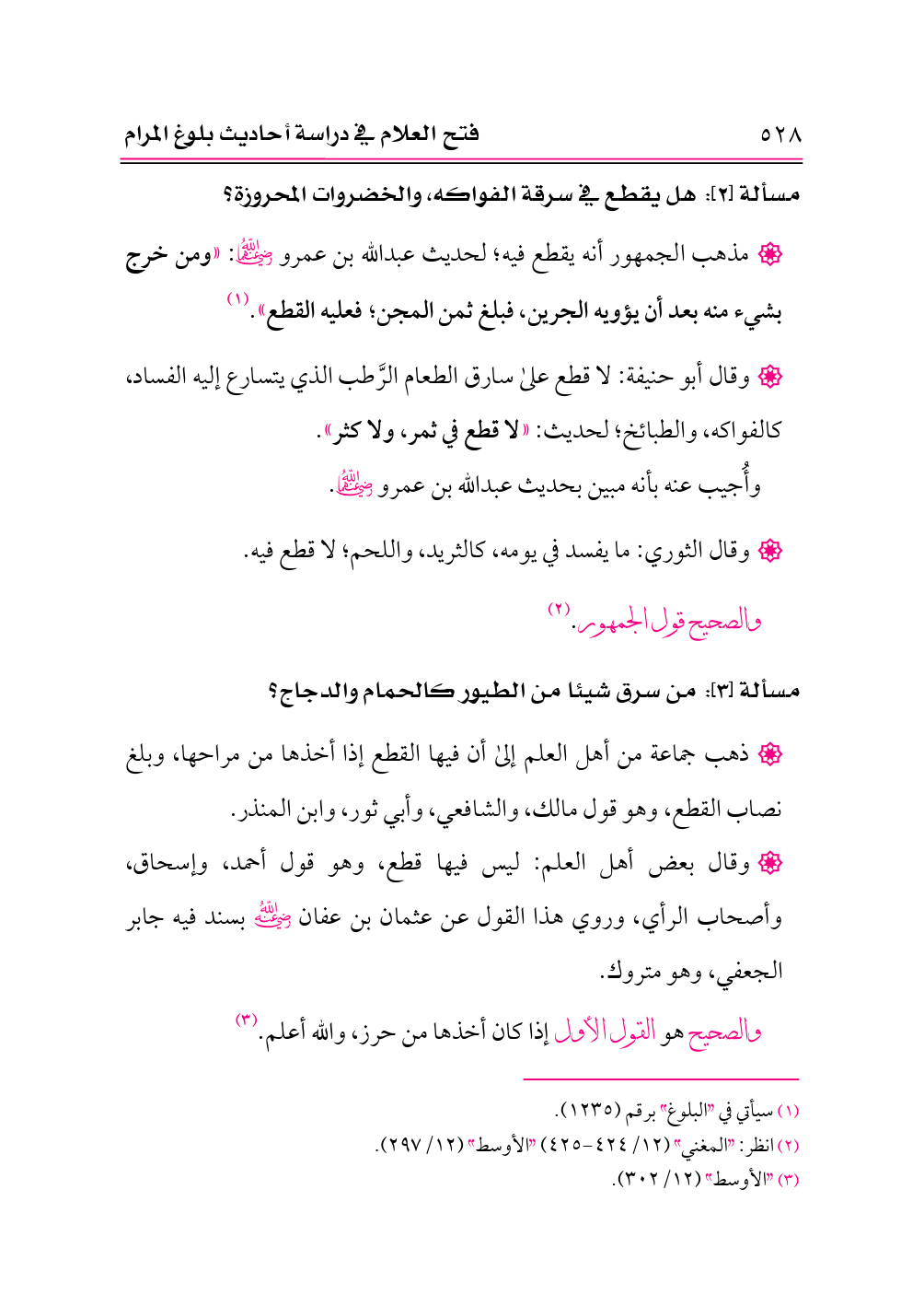 مسألة [٢]: هل يقطع في سرقة الفواكه، والخضروات المحروزة؟