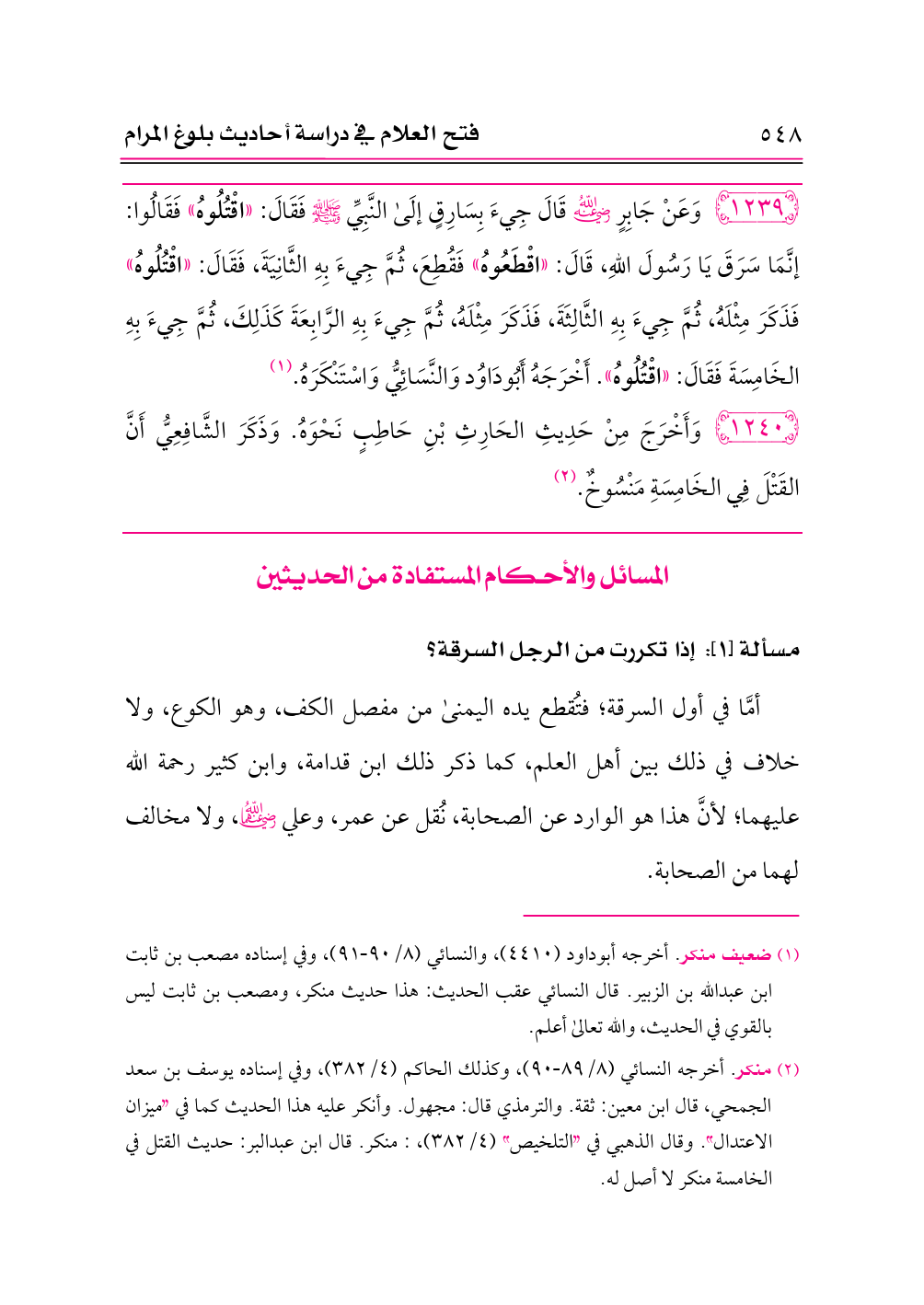 (¬٢) منكر. أخرجه النسائي (٨/ ٨٩ - ٩٠)، وكذلك الحاكم (٤/ ٣٨٢)، وفي إسناده يوسف بن سعد الجمحي، قال ابن معين: ثقة. والترمذي قال: مجهول. وأنكر عليه هذا الحديث كما في «ميزان الاعتدال». وقال الذهبي في «التلخيص» (٤/ ٣٨٢)،: منكر. قال ابن عبدالبر: حديث القتل في الخامسة منكر لا أصل له.