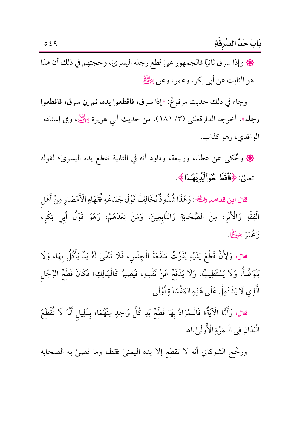 وجاء في ذلك حديث مرفوعٌ: «إذا سرق؛ فاقطعوا يده، ثم إن سرق؛ فاقطعوا رجله»، أخرجه الدارقطني (٣/ ١٨١)، من حديث أبي هريرة -رضي الله عنه-، وفي إسناده: الواقدي، وهو كذاب.