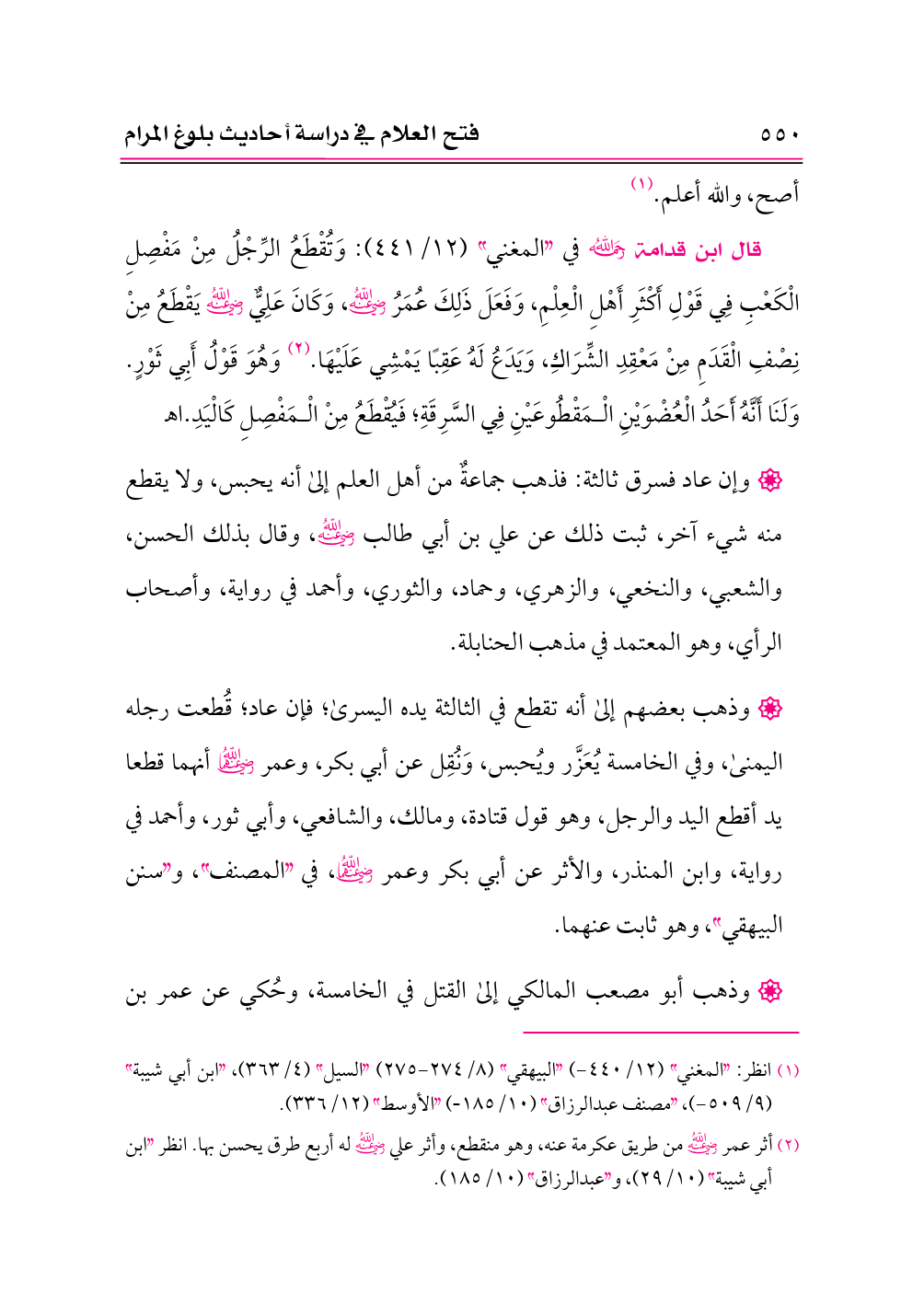 قال ابن قدامة -رحمه الله- في «المغني» (١٢/ ٤٤١): وَتُقْطَعُ الرِّجْلُ مِنْ مَفْصِلِ الْكَعْبِ فِي قَوْلِ أَكْثَرِ أَهْلِ الْعِلْمِ، وَفَعَلَ ذَلِكَ عُمَرُ -رضي الله عنه-، وَكَانَ عَلِيٌّ -رضي الله عنه- يَقْطَعُ مِنْ نِصْفِ الْقَدَمِ مِنْ مَعْقِدِ الشِّرَاكِ، وَيَدَعُ لَهُ عَقِبًا يَمْشِي عَلَيْهَا. (¬٢) وَهُوَ قَوْلُ أَبِي ثَوْرٍ. وَلَنَا أَنَّهُ أَحَدُ الْعُضْوَيْنِ الْمَقْطُوعَيْنِ فِي السَّرِقَةِ؛ فَيُقْطَعُ مِنْ الْمَفْصِلِ كَالْيَدِ. اهـ