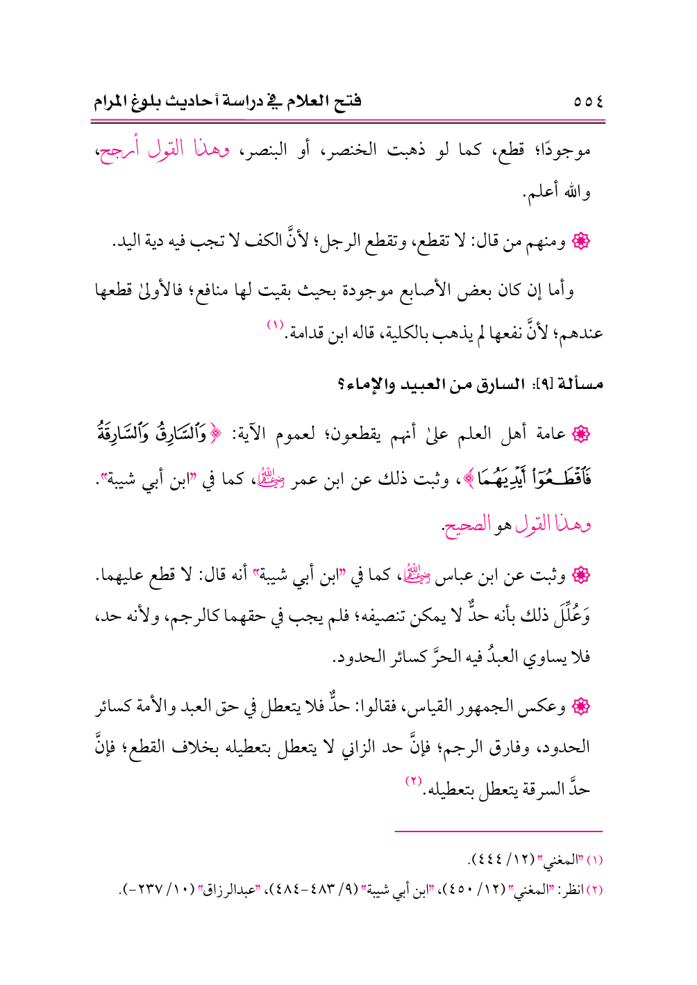 • وثبت عن ابن عباس -رضي الله عنهما-، كما في «ابن أبي شيبة» أنه قال: لا قطع عليهما. وَعُلِّلَ ذلك بأنه حدٌّ لا يمكن تنصيفه؛ فلم يجب في حقهما كالرجم، ولأنه حد، فلا يساوي العبدُ فيه الحرَّ كسائر الحدود.