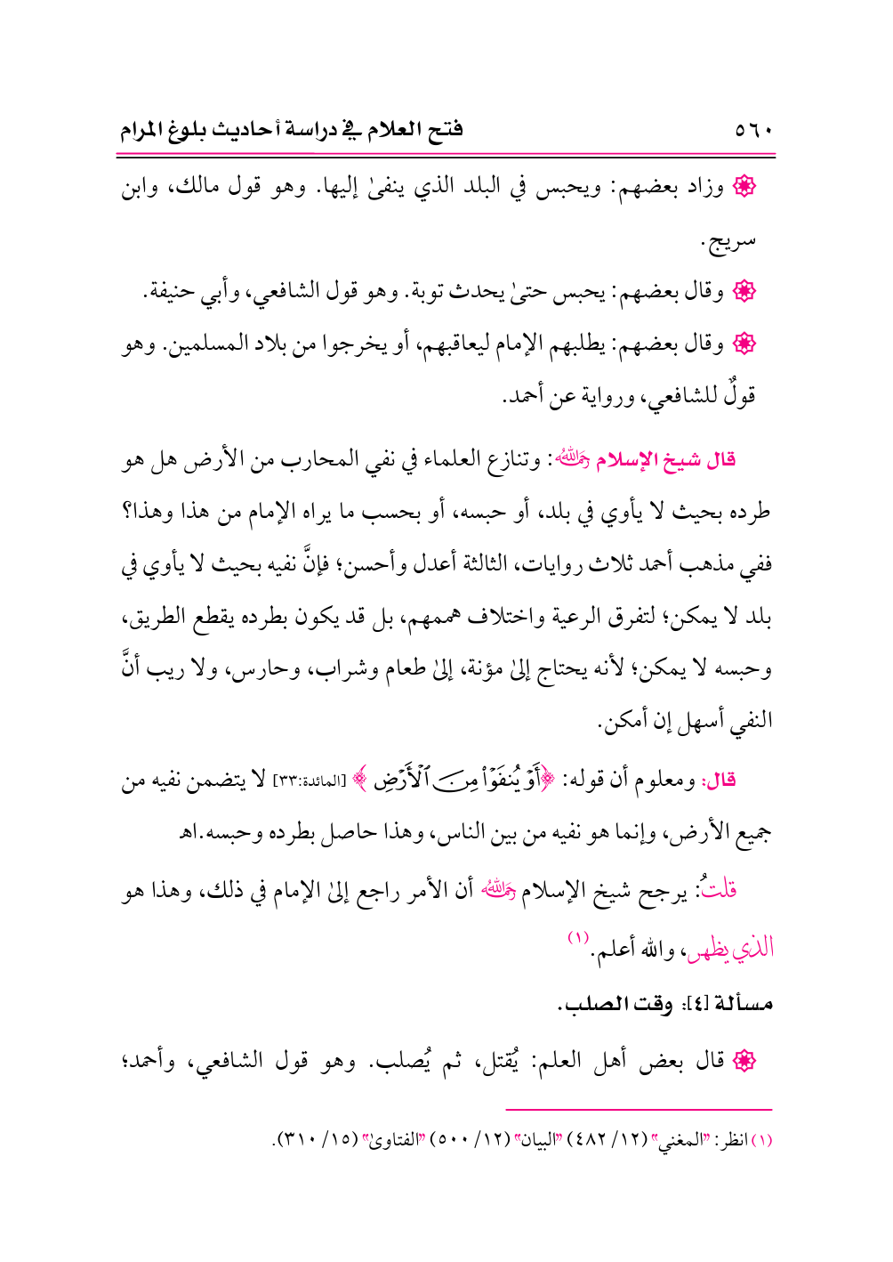 قلتُ: يرجح شيخ الإسلام -رحمه الله- أن الأمر راجع إلى الإمام في ذلك، وهذا هو الذي يظهر، والله أعلم. (¬١)