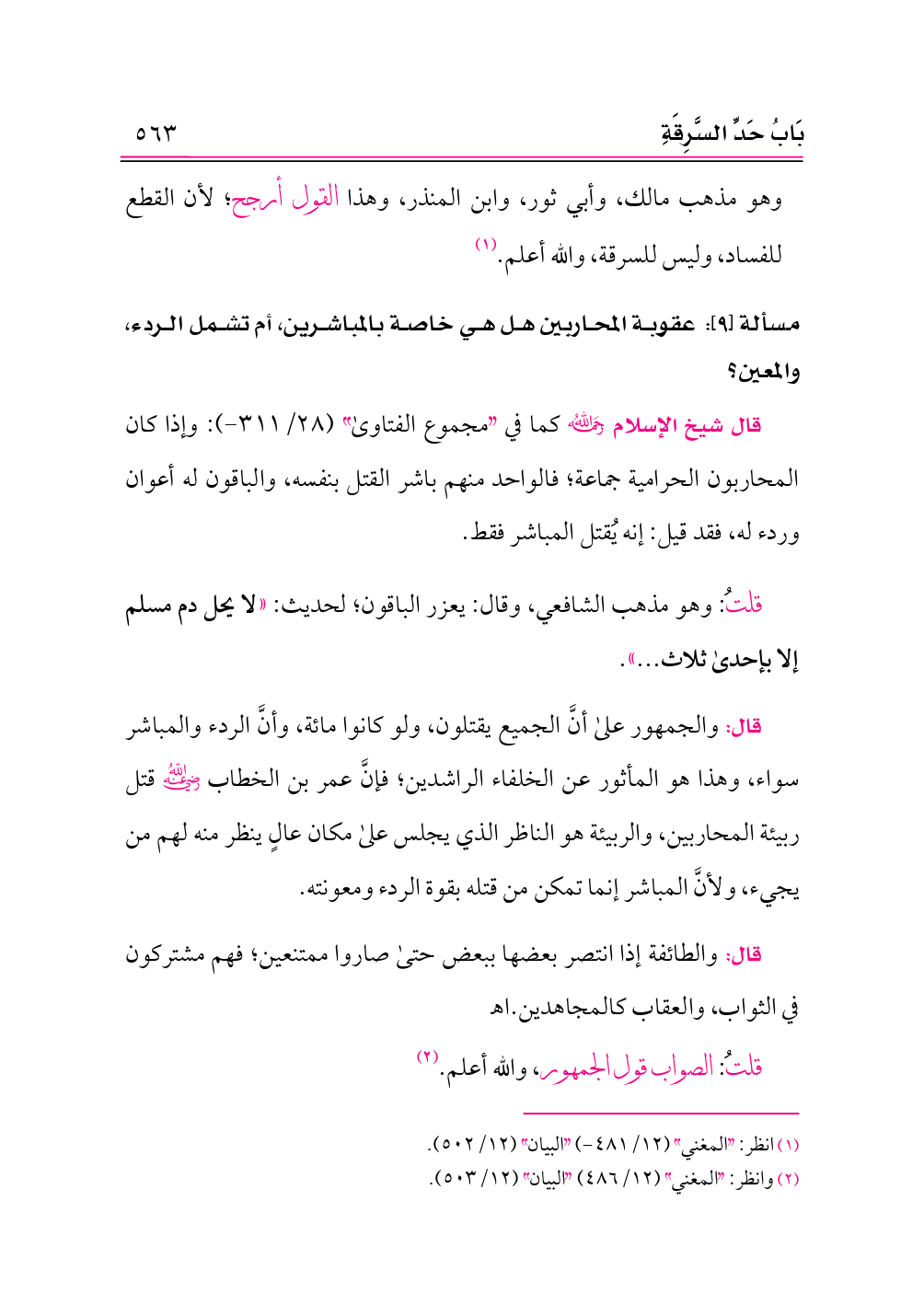قال شيخ الإسلام -رحمه الله- كما في «مجموع الفتاوى» (٢٨/ ٣١١ - ): وإذا كان المحاربون الحرامية جماعة؛ فالواحد منهم باشر القتل بنفسه، والباقون له أعوان وردء له، فقد قيل: إنه يُقتل المباشر فقط.