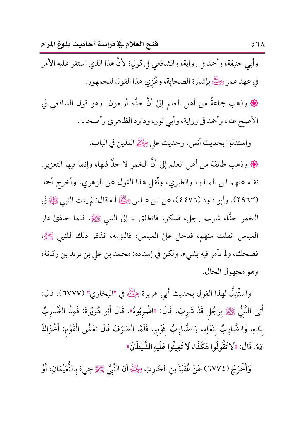 • وذهب طائفة من أهل العلم إلى أنَّ الخمر لا حدَّ فيها، وإنما فيها التعزير. نقله عنهم ابن المنذر، والطبري، ونُقل هذا القول عن الزهري، وأخرج أحمد (٢٩٦٣)، وأبو داود (٤٤٧٦)، عن ابن عباس -رضي الله عنهما- أنه قال: لم يقت النبي - صلى الله عليه وسلم - في الخمر حدًّا، شرب رجل، فسكر، فانطلق به إلى النبي - صلى الله عليه وسلم -، فلما حاذى دار العباس انفلت منهم، فدخل على العباس، فالتزمه، فذكر ذلك للنبي - صلى الله عليه وسلم -، فضحك، ولم يأمر فيه بشيء. ولكن في إسناده: محمد بن علي بن يزيد بن ركانة، وهو مجهول الحال.