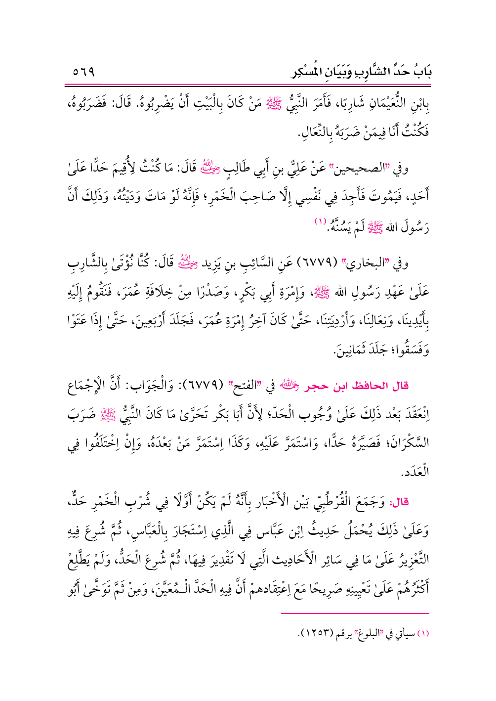 قال الحافظ ابن حجر -رحمه الله- في «الفتح» (٦٧٧٩): وَالْجَوَاب: أَنَّ الْإِجْمَاع اِنْعَقَدَ بَعْد ذَلِكَ عَلَى وُجُوب الْحَدّ؛ لِأَنَّ أَبَا بَكْر تَحَرَّى مَا كَانَ النَّبِيُّ - صلى الله عليه وسلم - ضَرَبَ السَّكْرَانَ؛ فَصَيَّرَهُ حَدًّا، وَاسْتَمَرَّ عَلَيْهِ، وَكَذَا اِسْتَمَرَّ مَنْ بَعْدَهُ، وَإِنْ اِخْتَلَفُوا فِي الْعَدَد.