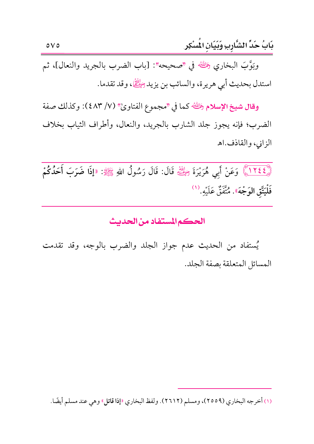 ١٢٤٤ - وَعَنْ أَبِي هُرَيْرَةَ -رضي الله عنه- قَالَ: قَالَ رَسُولُ اللهِ - صلى الله عليه وسلم -: «إذَا ضَرَبَ أَحَدُكُمْ فَلْيَتَّقِ الوَجْهَ». مُتَّفَقٌ عَلَيْهِ. (¬١)