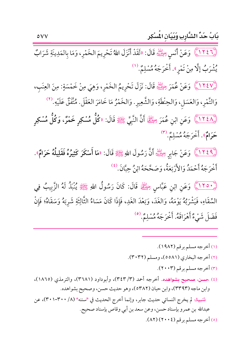 ١٢٤٨ - وَعَنِ ابْنِ عُمَرَ -رضي الله عنهما- أَنَّ النَّبِيَّ - صلى الله عليه وسلم - قَالَ: «كُلُّ مُسْكِرٍ خَمْرٌ، وَكُلُّ مُسْكِرٍ حَرَامٌ». أَخْرَجَهُ مُسْلِمٌ. (¬٣)