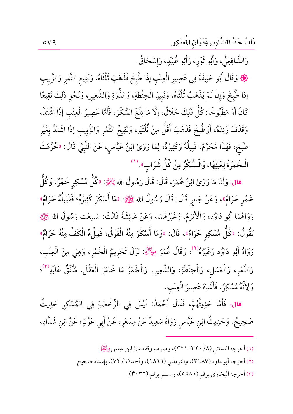 قال: وَلَنَا مَا رَوَى ابْنُ عُمَرَ، قَالَ: قَالَ رَسُولُ الله - صلى الله عليه وسلم -: «كُلُّ مُسْكِرٍ خَمْرٌ، وَكُلُّ خَمْرٍ حَرَامٌ»، وَعَنْ جَابِرٍ قَالَ: قَالَ رَسُولُ الله - صلى الله عليه وسلم -: «مَا أَسْكَرَ كَثِيرُهُ؛ فَقَلِيلُهُ حَرَامٌ» رَوَاهُمَا أَبُو دَاوُد، وَالْأَثْرَمُ، وَغَيْرُهُمَا، وَعَنْ عَائِشَةَ قَالَتْ: سَمِعْت رَسُولَ الله - صلى الله عليه وسلم - يَقُولُ: «كُلُّ مُسْكِرٍ حَرَامٌ»، قَالَ: «وَمَا أَسْكَرَ مِنْهُ الْفَرْقُ؛ فَمِلْءُ الْكَفِّ مِنْهُ حَرَامٌ» رَوَاهُ أَبُو دَاوُد وَغَيْرُهُ (¬٢)، وَقَالَ عُمَرُ -رضي الله عنه-: نَزَلَ تَحْرِيمُ الْخَمْرِ، وَهِيَ مِنْ الْعِنَبِ، وَالتَّمْرِ، وَالْعَسَلِ، وَالْحِنْطَةِ، وَالشَّعِيرِ. وَالْخَمْرُ مَا خَامَرَ الْعَقْلَ. مُتَّفَقٌ عَلَيْهِ (¬٣)؛ وَلِأَنَّهُ مُسْكِرٌ، فَأَشْبَهَ عَصِيرَ الْعِنَبِ.