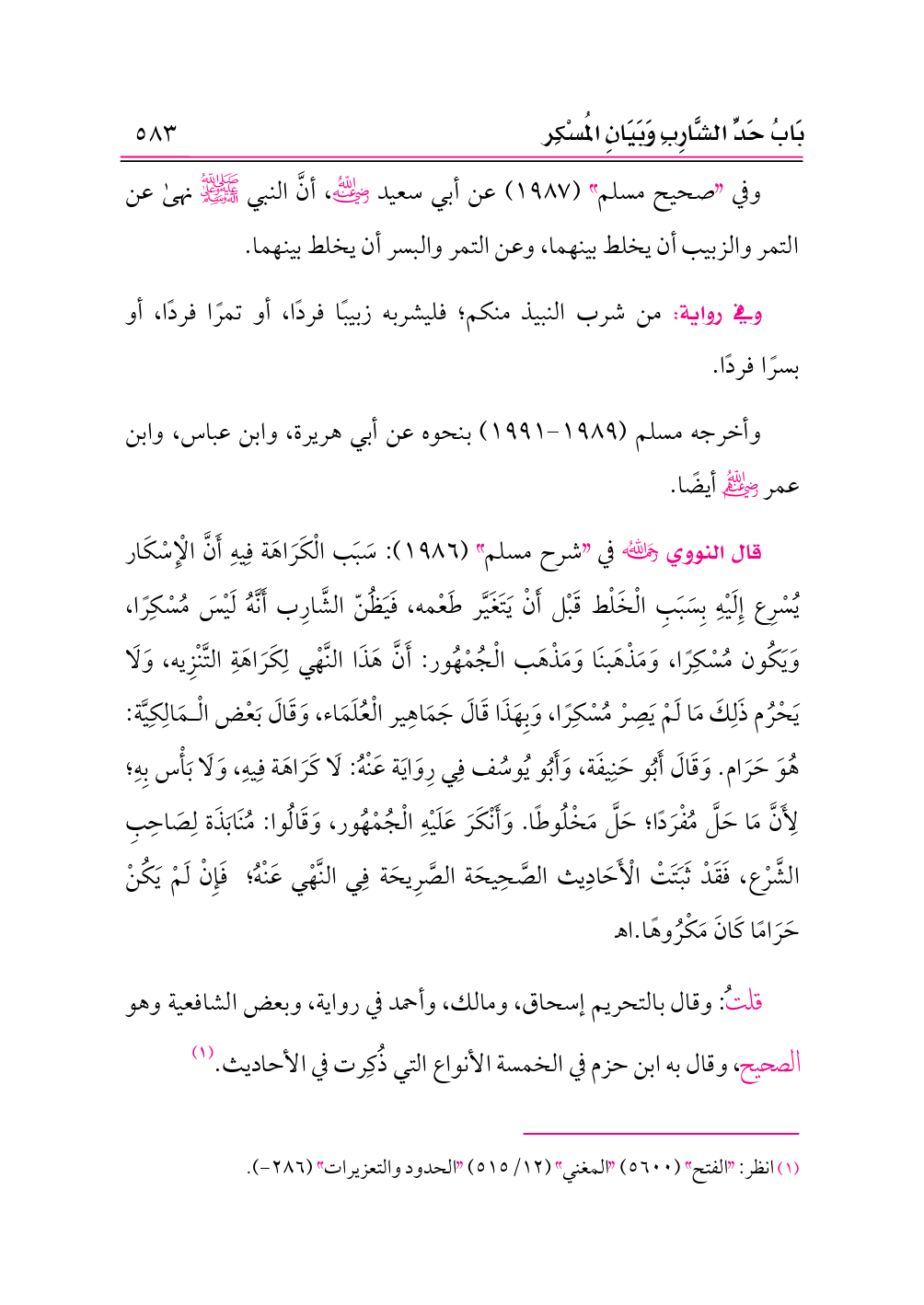 قال النووي -رحمه الله- في «شرح مسلم» (١٩٨٦): سَبَب الْكَرَاهَة فِيهِ أَنَّ الْإِسْكَار يُسْرِع إِلَيْهِ بِسَبَبِ الْخَلْط قَبْل أَنْ يَتَغَيَّر طَعْمه، فَيَظُنّ الشَّارِب أَنَّهُ لَيْسَ مُسْكِرًا، وَيَكُون مُسْكِرًا، وَمَذْهَبنَا وَمَذْهَب الْجُمْهُور: أَنَّ هَذَا النَّهْي لِكَرَاهَةِ التَّنْزِيه، وَلَا يَحْرُم ذَلِكَ مَا لَمْ يَصِرْ مُسْكِرًا، وَبِهَذَا قَالَ جَمَاهِير الْعُلَمَاء، وَقَالَ بَعْض الْمَالِكِيَّة: هُوَ حَرَام. وَقَالَ أَبُو حَنِيفَة، وَأَبُو يُوسُف فِي رِوَايَة عَنْهُ: لَا كَرَاهَة فِيهِ، وَلَا بَأْس بِهِ؛ لِأَنَّ مَا حَلَّ مُفْرَدًا؛ حَلَّ مَخْلُوطًا. وَأَنْكَرَ عَلَيْهِ الْجُمْهُور، وَقَالُوا: مُنَابَذَة لِصَاحِبِ الشَّرْع، فَقَدْ ثَبَتَتْ الْأَحَادِيث الصَّحِيحَة الصَّرِيحَة فِي النَّهْي عَنْهُ؛ فَإِنْ لَمْ يَكُنْ حَرَامًا كَانَ مَكْرُوهًا. اهـ