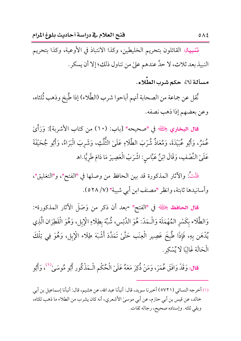 (¬١) أخرجه النسائي (٥٧٢١) أخبرنا سويد، قال: أنبأنا عبد الله، عن هشيم، قال: أنبأنا إسماعيل بن أبي خالد، عن قيس بن أبي حازم، عن أبي موسى الأشعري، أنه كان يشرب من الطلاء ما ذهب ثلثاه، وبقي ثلثه. وإسناده صحيح، رجاله ثقات.