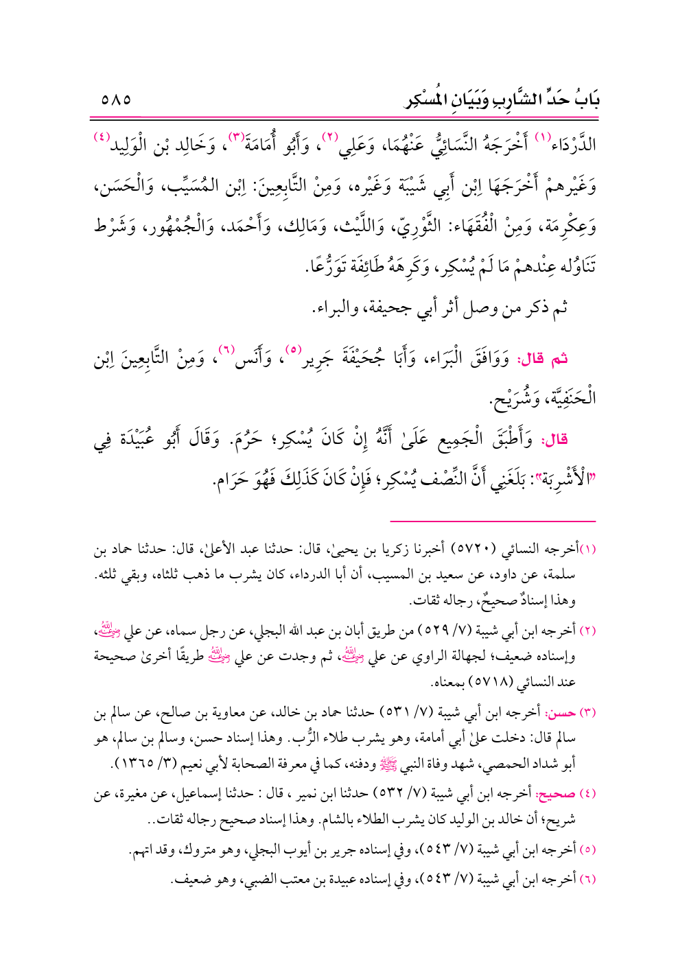 (¬٣) حسن: أخرجه ابن أبي شيبة (٧/ ٥٣١) حدثنا حماد بن خالد، عن معاوية بن صالح، عن سالم بن سالم قال: دخلت على أبي أمامة، وهو يشرب طلاء الرُّب. وهذا إسناد حسن، وسالم بن سالم، هو أبو شداد الحمصي، شهد وفاة النبي - صلى الله عليه وسلم - ودفنه، كما في معرفة الصحابة لأبي نعيم (٣/ ١٣٦٥).